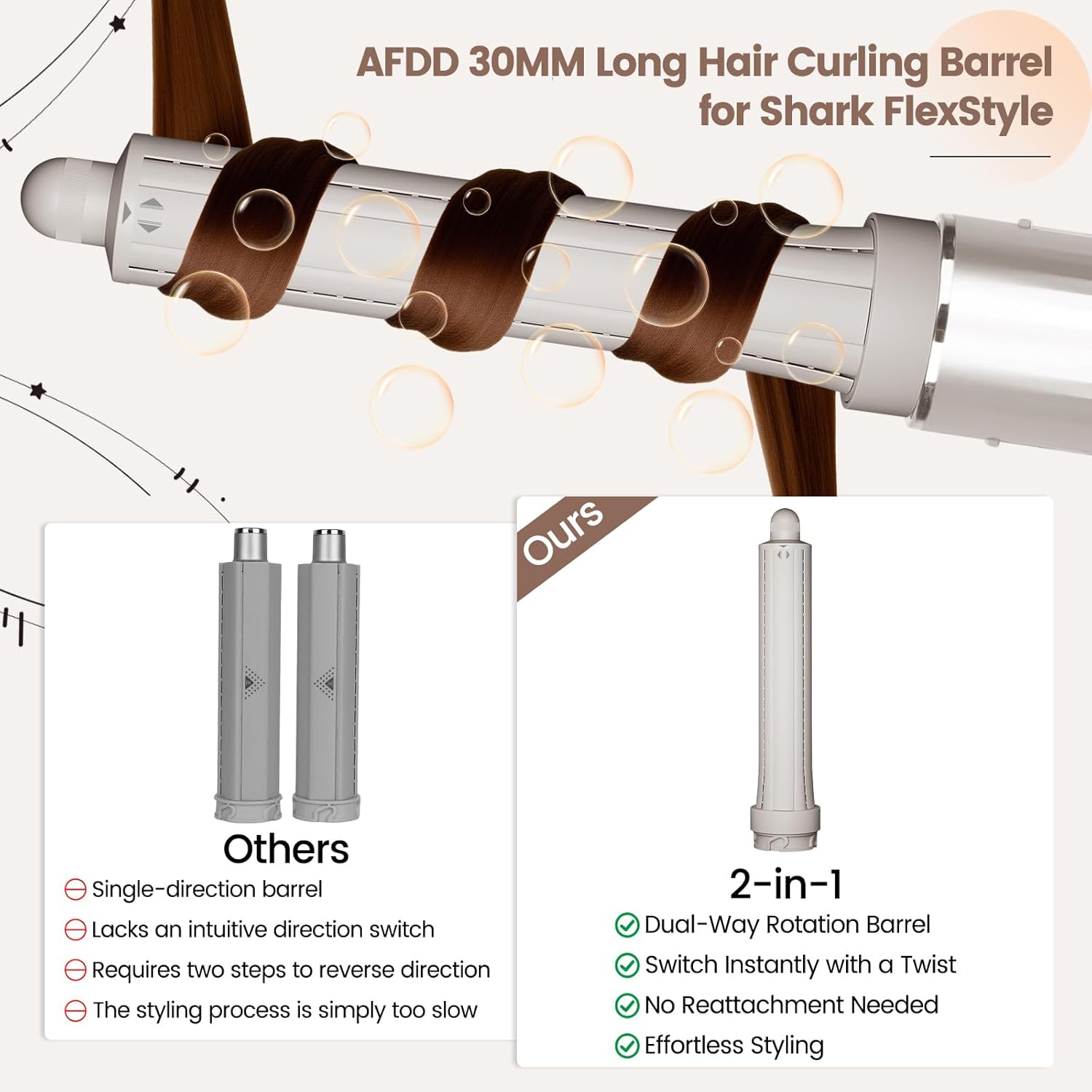Compatibility: The AFDD includes 3 sizes hair curling barrel (tapered barrel, 1.2in, 1.6in). No matter which version you own, you can create waves, spirals, or loose curls, all in one set. This long barrel nozzle Compatible with Shark FlexStyle HD400 Series. Notes: Not Compatible with Shark FlexFusion HD600 Series. Not Compatible with Shark SpeedStyle/Pro/Pro Flex Hair Dryer
