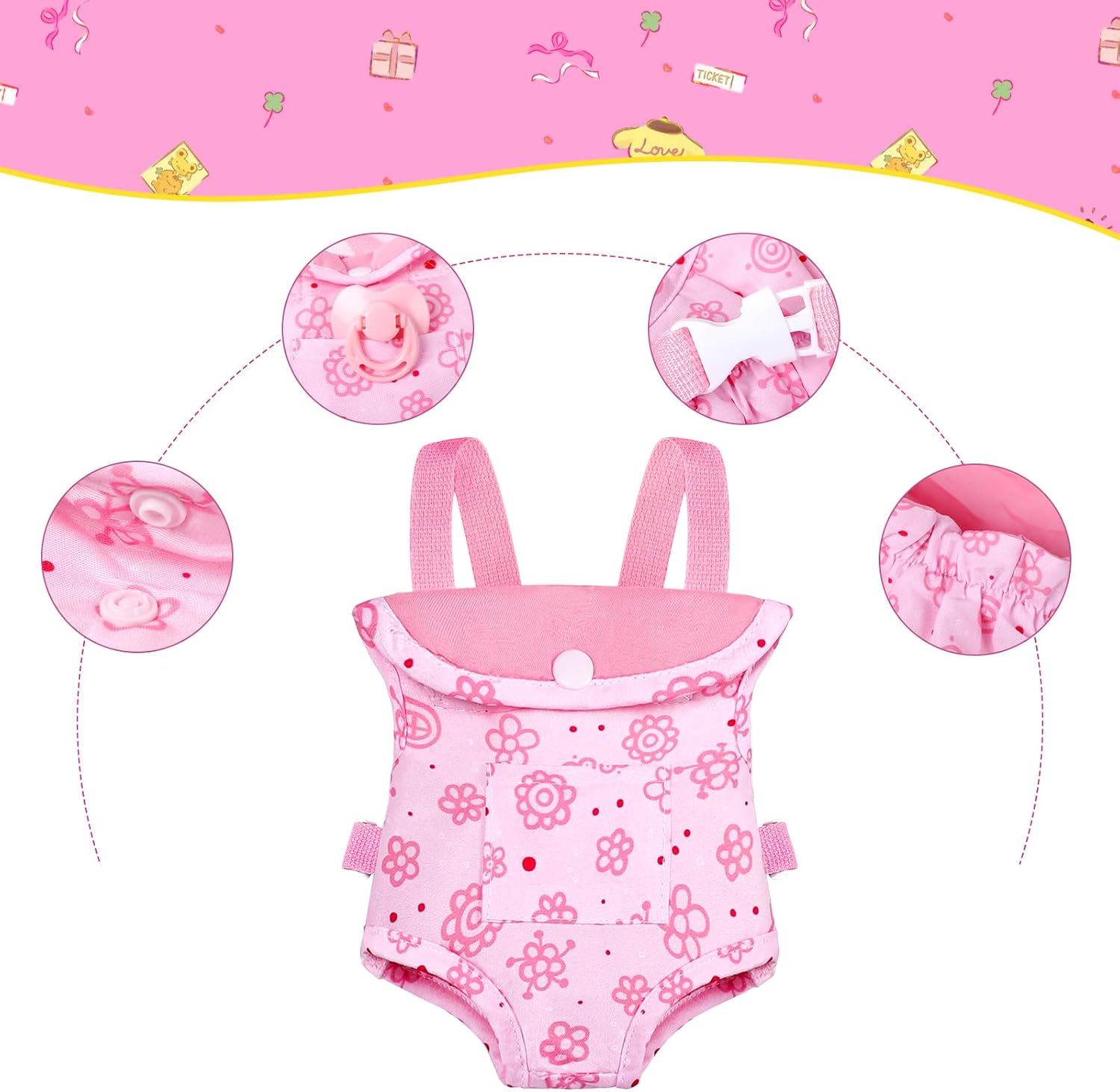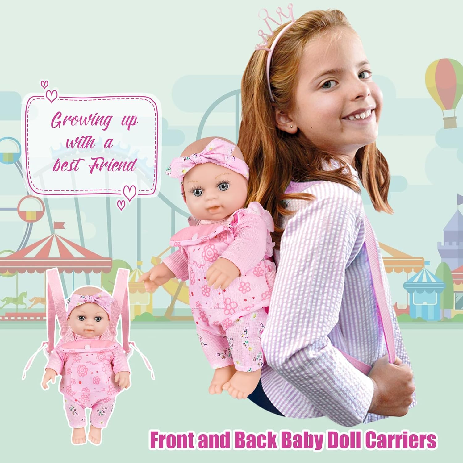 UNIQUE DESIGN FRONT AND BACK CARRIER: This toy baby doll comes with a cute carrier,that’s easy for kids to carry and pack her doll to anywhere.The array of accessories to enhance the play experience. It’s includes a bottle for feeding, a pacifier, and a cute outfit to keep things fresh and engaging, add layers of fun.