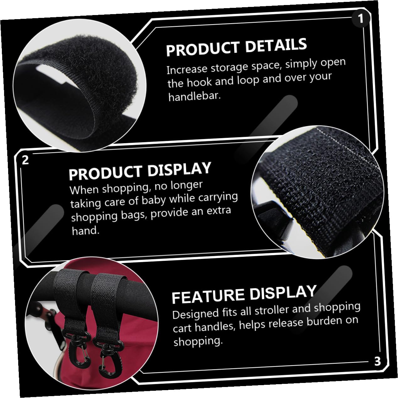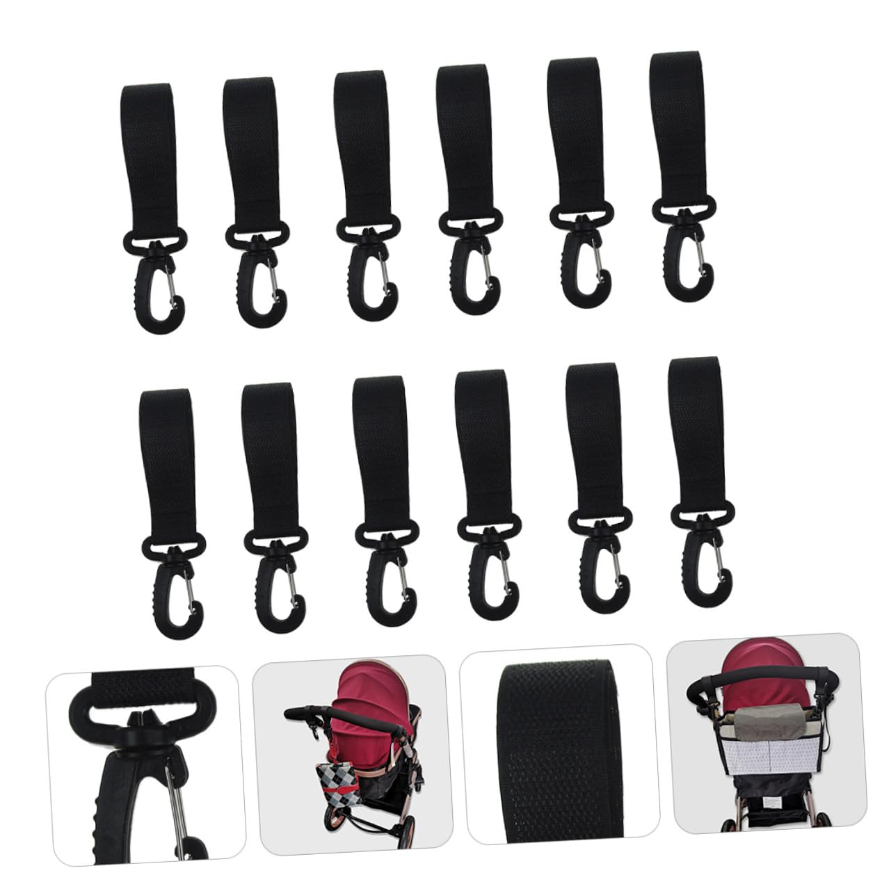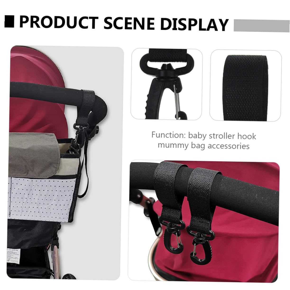 rotatable stroller hooks for bags This is an excellent way to free up your hands can push your stroller instead of holding bags. stroller hooks Quality polyester and plastic material, smooth for handle and provide strong loading capacity. stroller hooks clip These hooks are made of .pram hooks for bags These stroller hooks give you the flexibility you need to