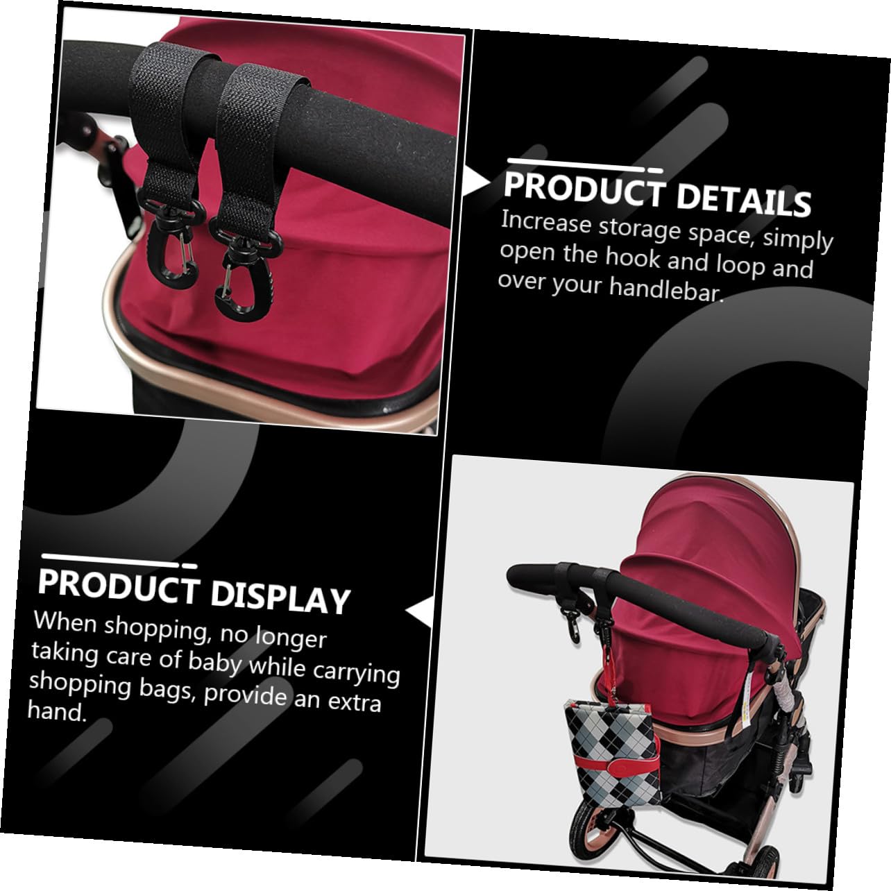 -Protects your diaper bags, purses in order, as well as providing extra space for your stroller handle pram hooks for bags.