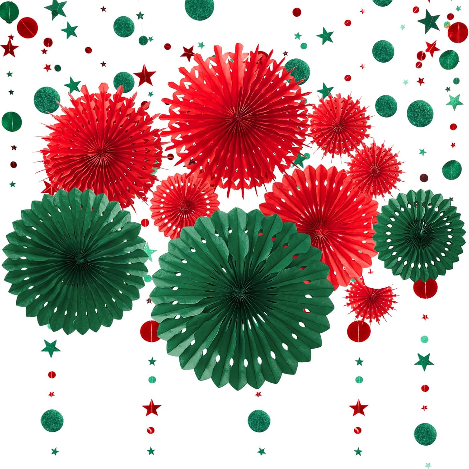 Complete Red and Green Christmas Decorations Kit: this kit includes 10 hanging paper fans in red and green and 3 Christmas garland banners measuring about 13 ft each; It provides an easy way to decorate for Christmas parties, holiday birthdays, classrooms, and office celebrations