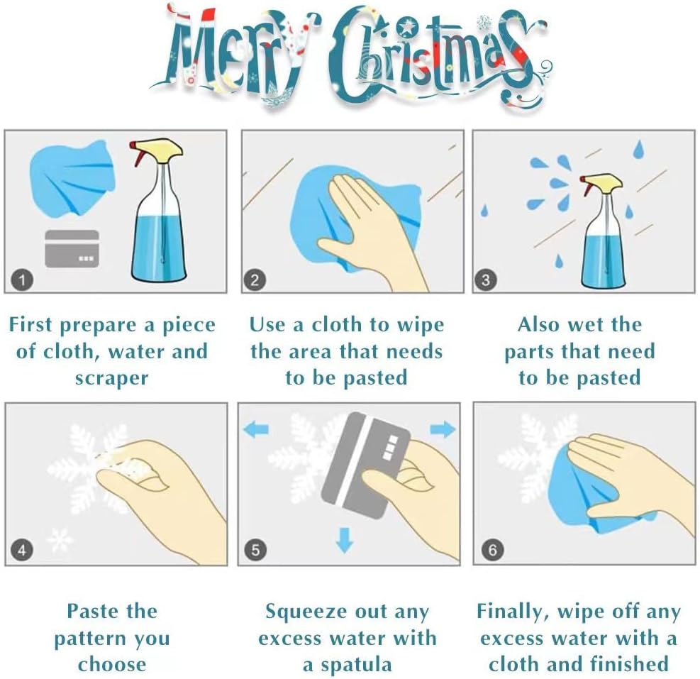 Christmas Window Stickers are Easy to Stick: Make sure the surface is smooth and free of any textures (such as mirrors and glass) and clean the surface to make sure there is no dust and grease before sticking the Christmas stickers.Spray a little water on the surface, the water will make them stick better. Then you can enjoy your snowflake window stickers, pretty and festive.