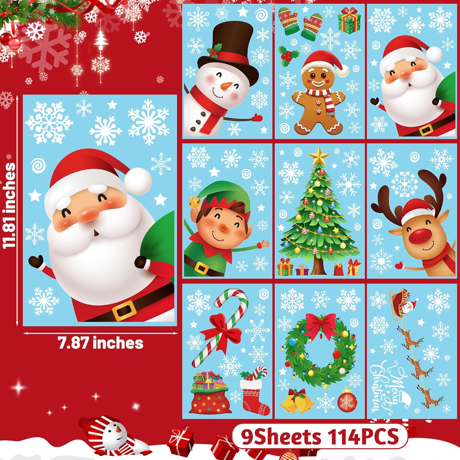144 PCS Christmas Window Clings, Snowflake Window Clings for Stickers for Glass, Christmas Decorations Decals for Snowman Santa Claus Tree Reindeer Elf Winter Party Accessories Supplies Decor