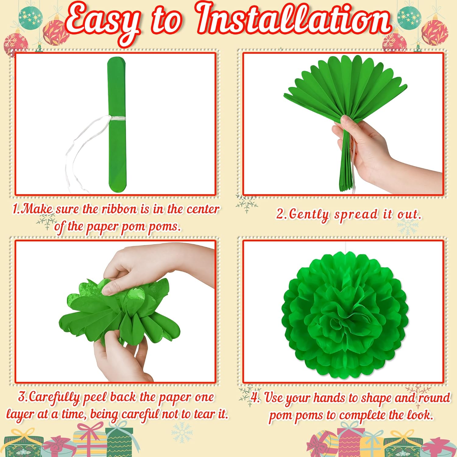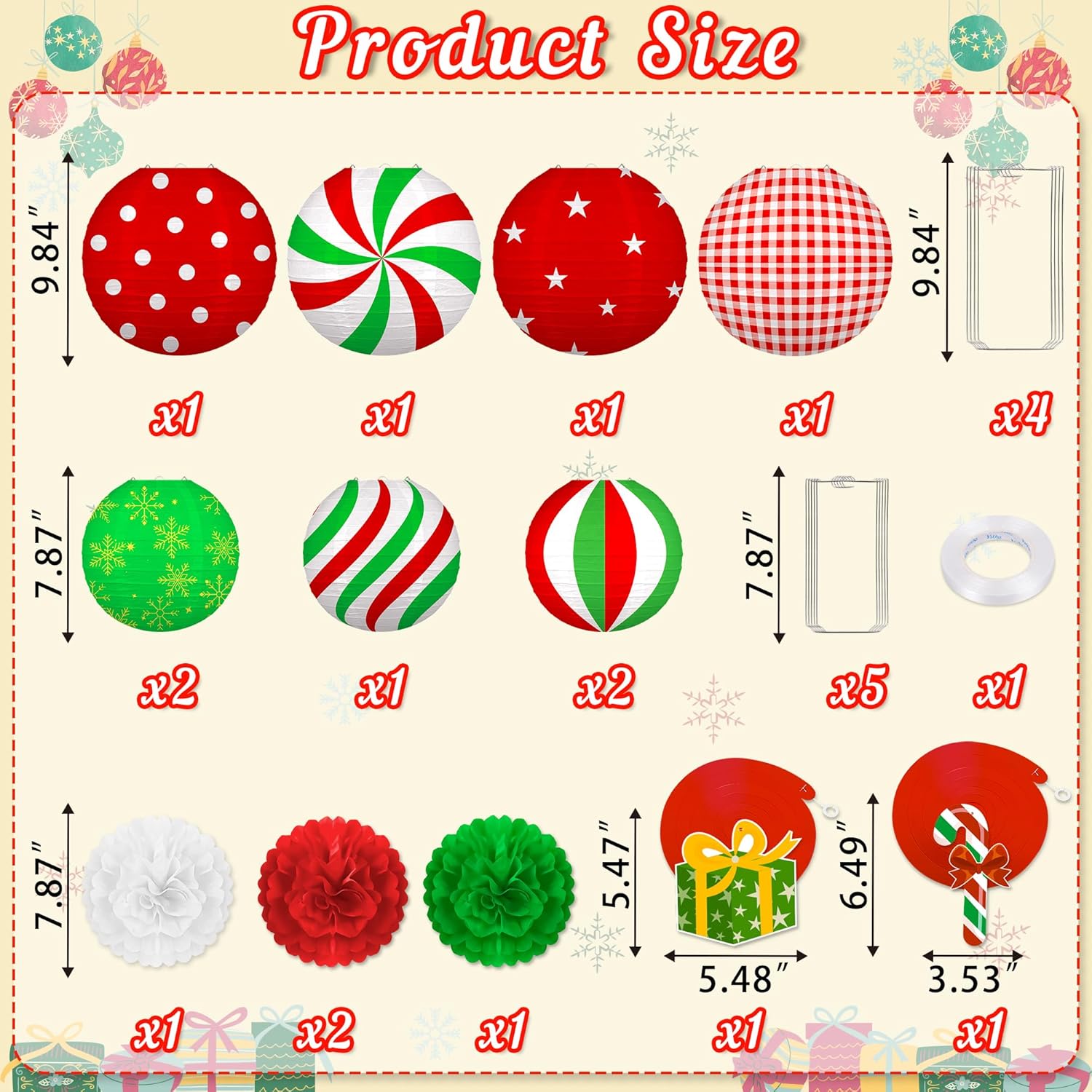Christmas Party Decorations Set: Package includes 9 paper lanterns(7 designs); 9 iron frames, 4pcs paper pom poms(2 different colors) and 2 hanging swirls