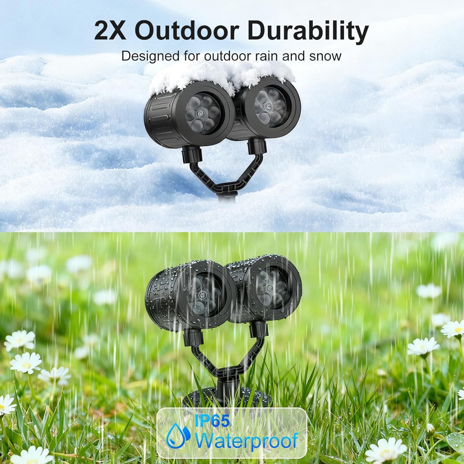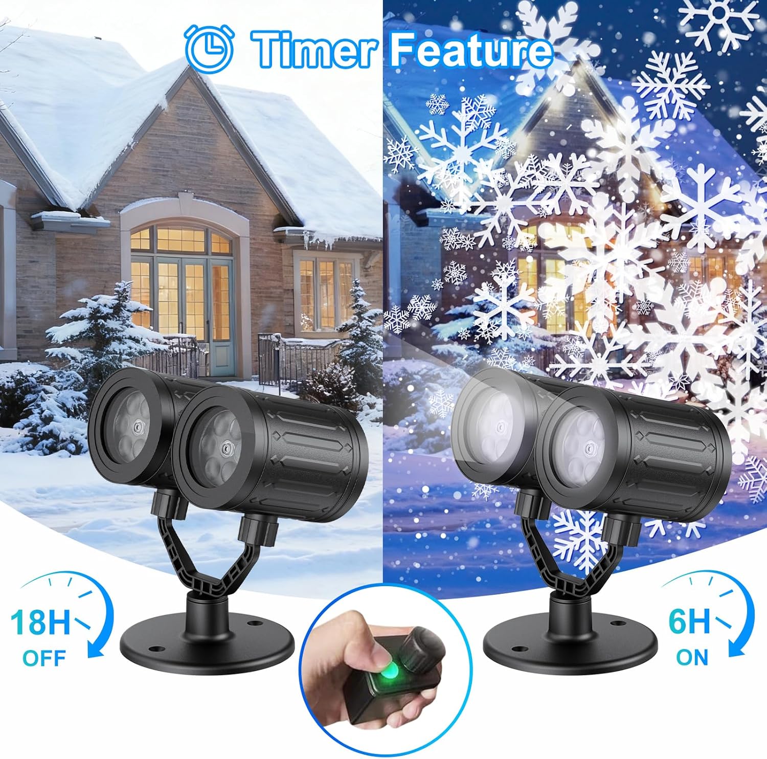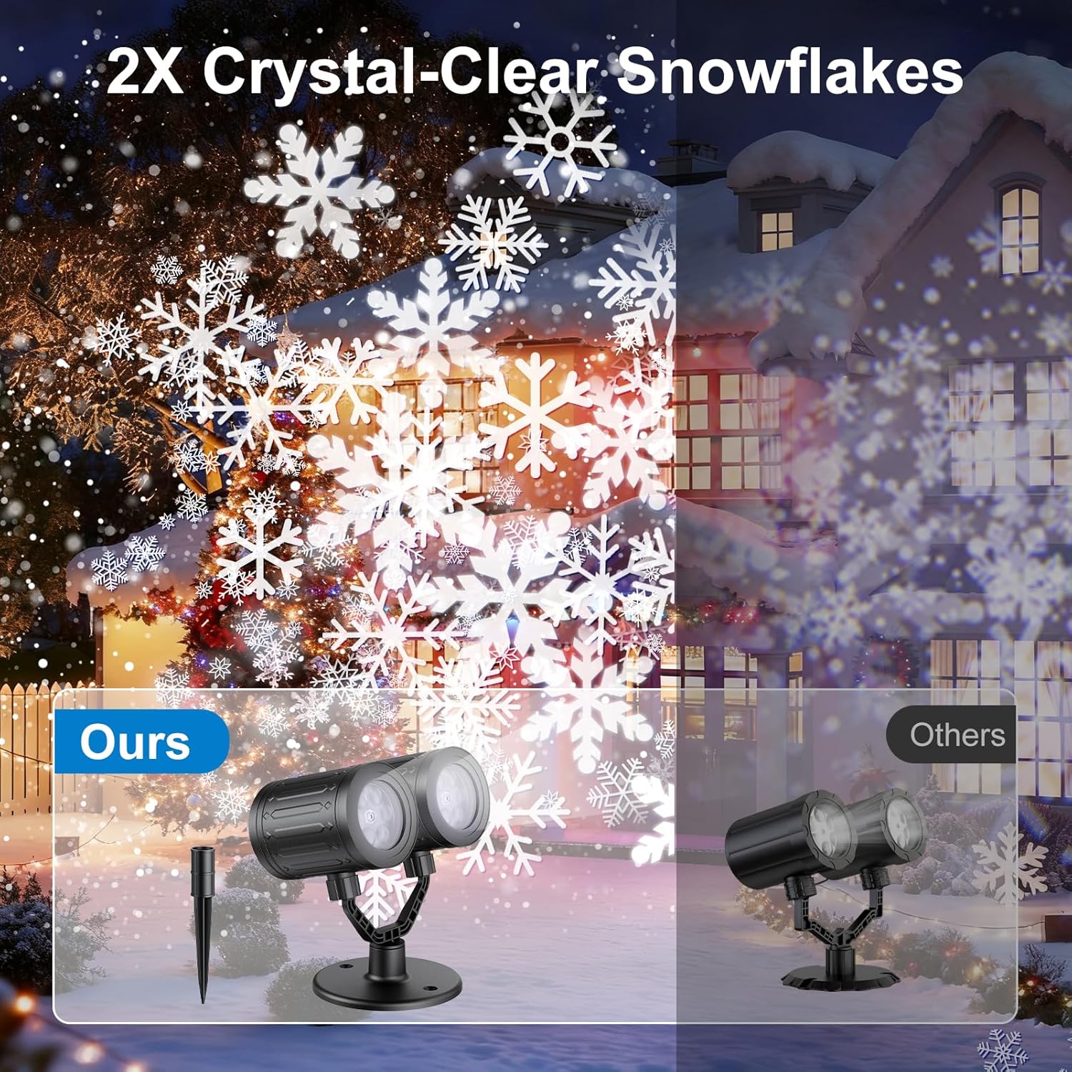 【2025 Christmas Double-Head Snowflake Lights】 – Transform your home this 2025 Christmas into a stunning winter wonderland with our upgraded Christmas projector lights outdoor — Crystal-clear, more festive, and more magical than ever! Featuring dual projection heads and 4 dynamic brighter snowflake patterns, creating a lifelike snowfall effect everynight. Perfect for decorating your house, garden, lawn, wall, window, ceiling or garage—just turn it on and enjoy the festive magic with your loved ones.
