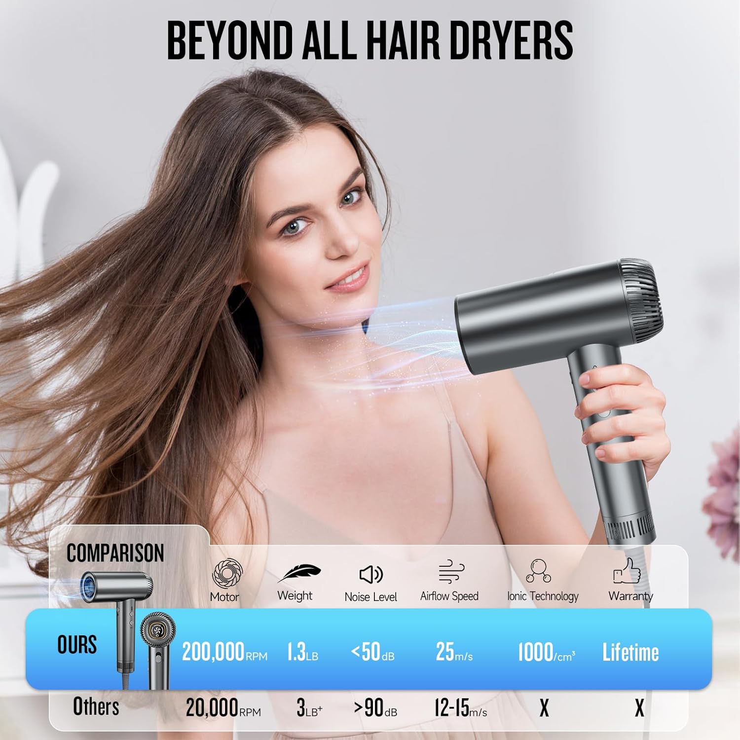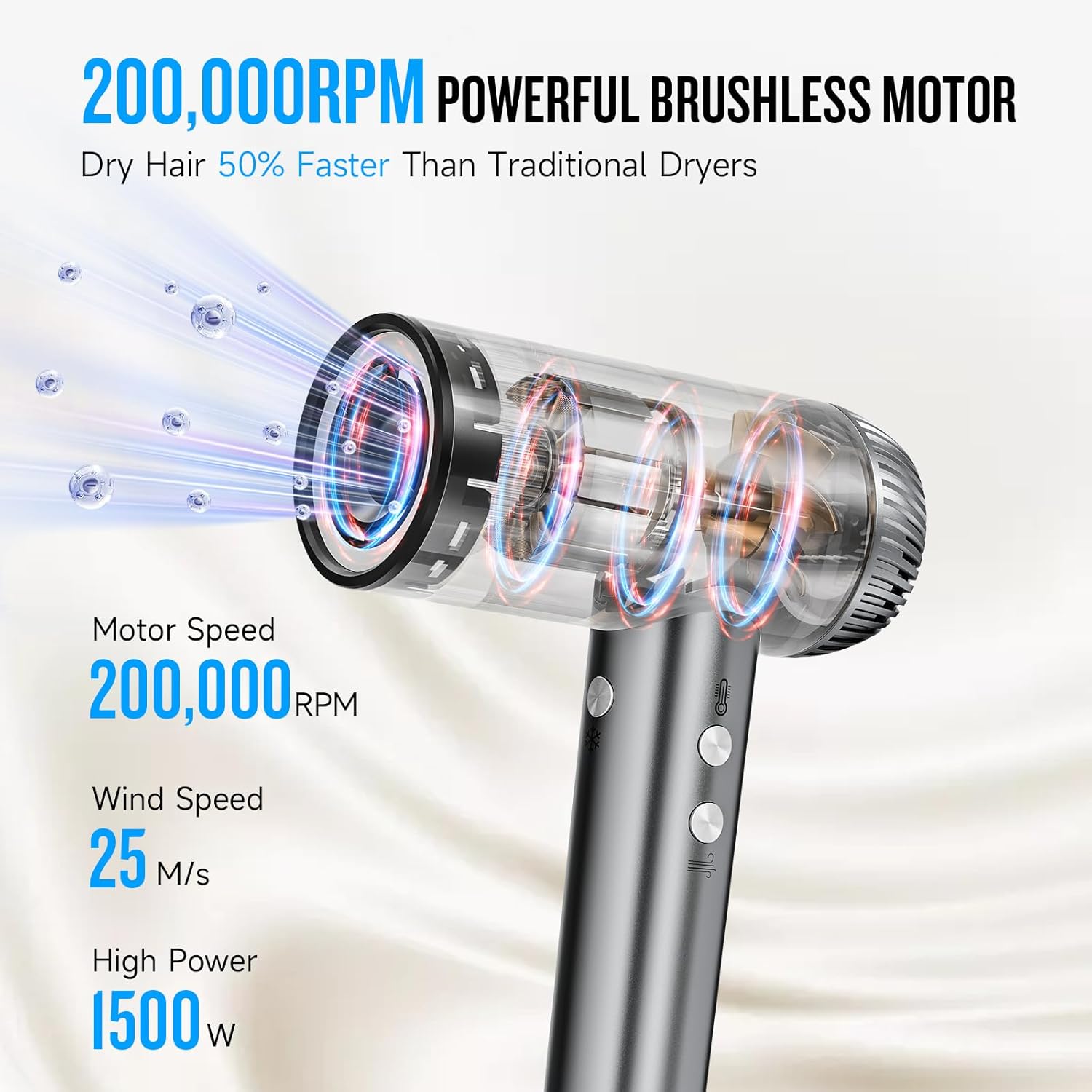 DOFOU hair dryers for women features a 2025 upgraded brushless motor that reaches 200,000 RPM high speed, which dries your hair in 2 MINUTES