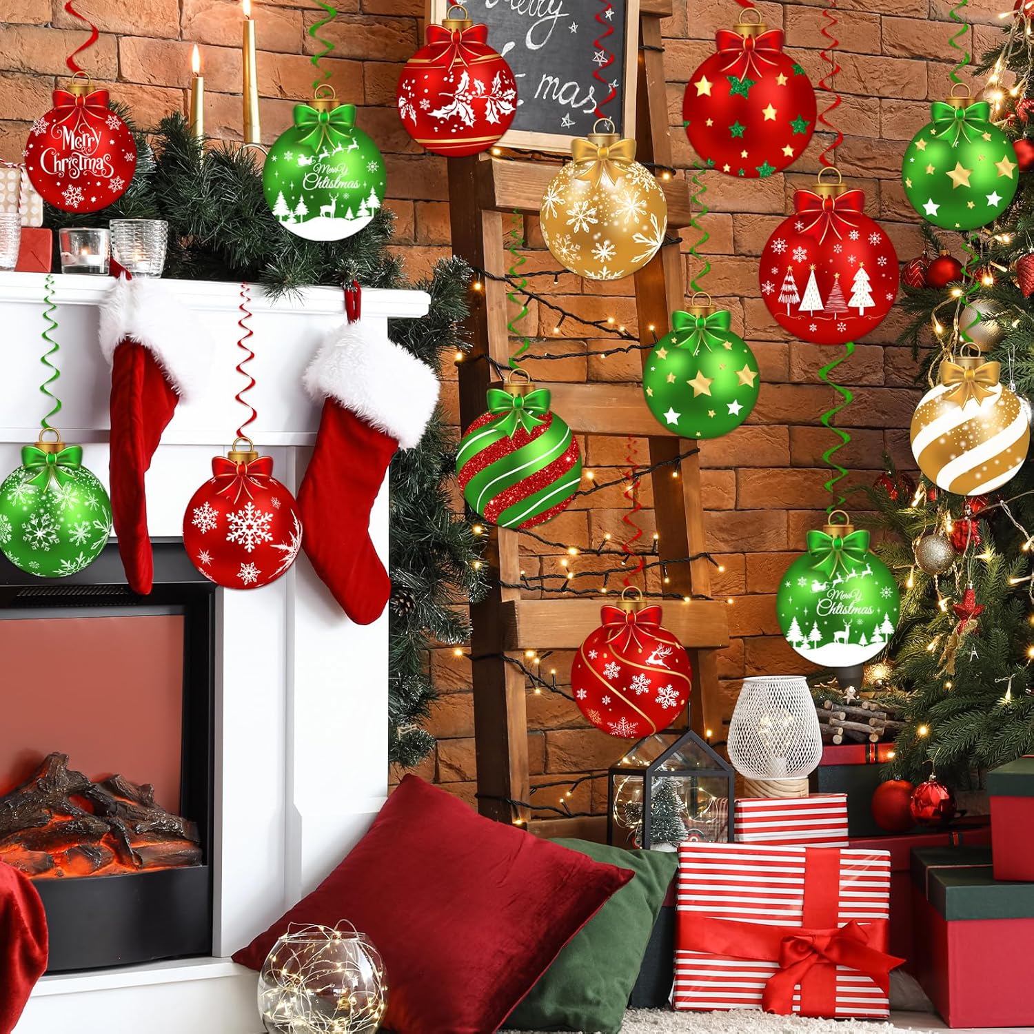 HANGING CHRISTMAS DECORATIONS:Christmas decorations wall ceiling hanging decoration will meet your Christmas party needs.You will get 24pcs Christmas ball sign foil Christmas ceiling hanging decorations come with 12pcs different card cutouts;24pcs whirls glitter foil ceiling swirls Christmas streamers in red and green and clear plastic hooks for hanging. You can easily create Christmas atmosphere, giving your Xmas party a very formal and unique feeling