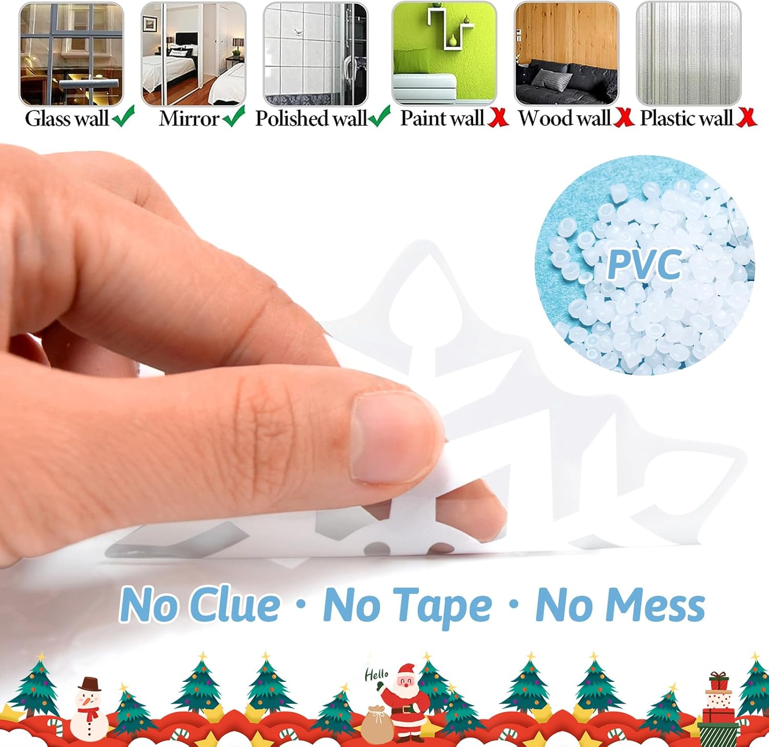 NO GLUE, NO TAPE, NO MESS: Our festive Christmas window stickers, easy to put up without any gummy adhesive or tape, stick all by themselves. Easy removal without damaging the glass, never leave any marks. Christmas decals, made by high quality electrostatic membrane PVC material, reusable to place it back on the base sheets, store it in a cool place for next year use