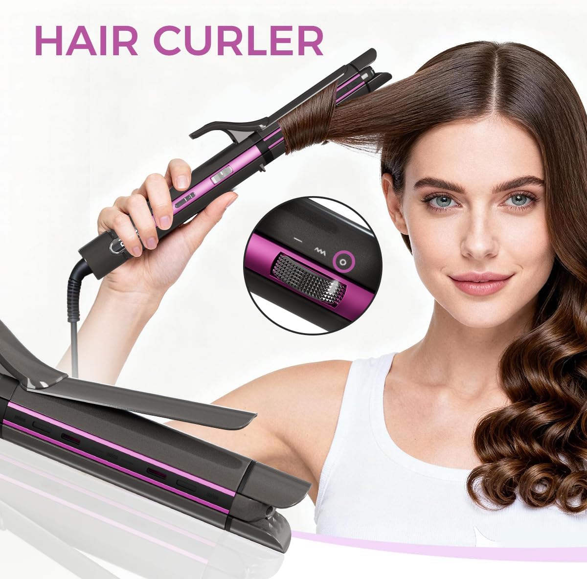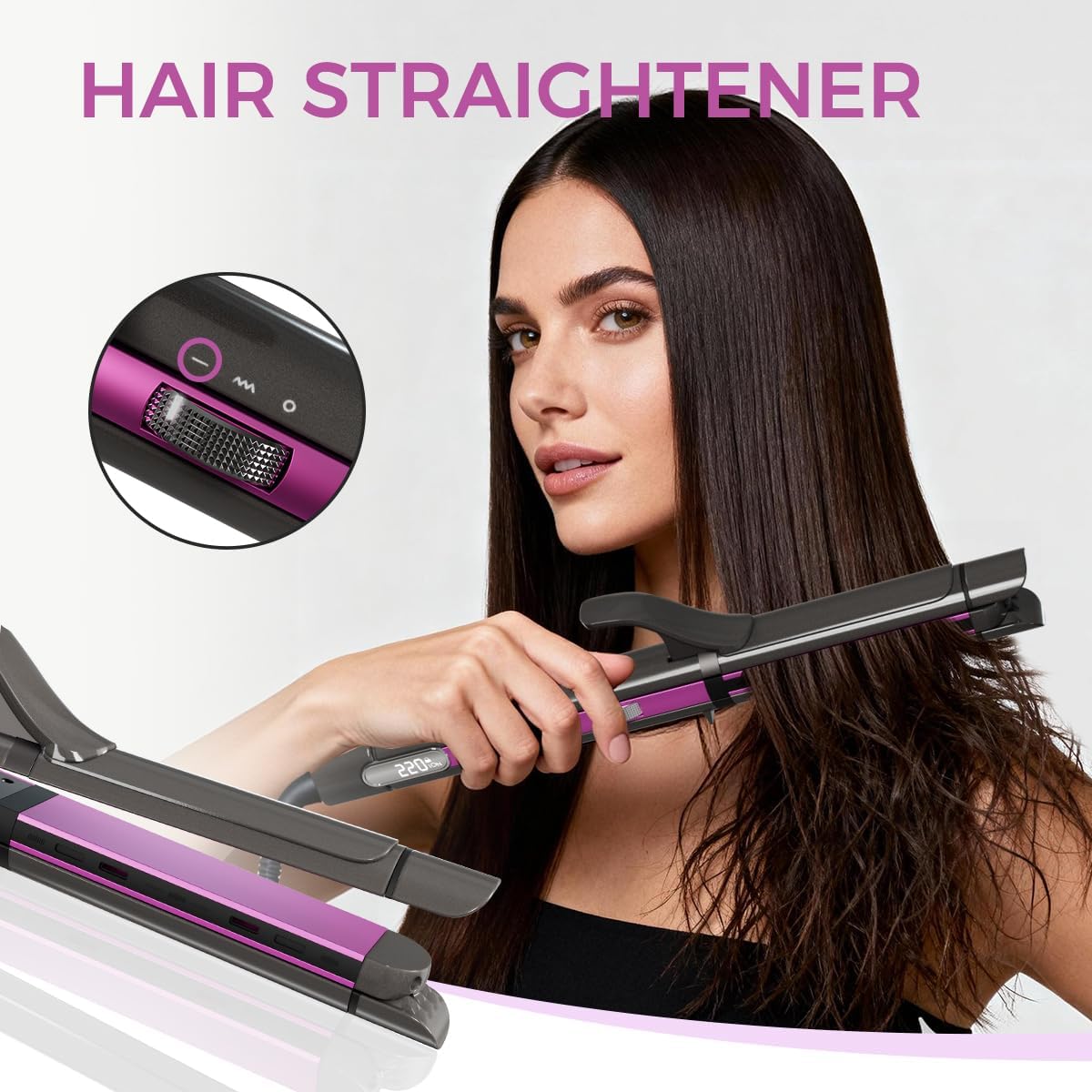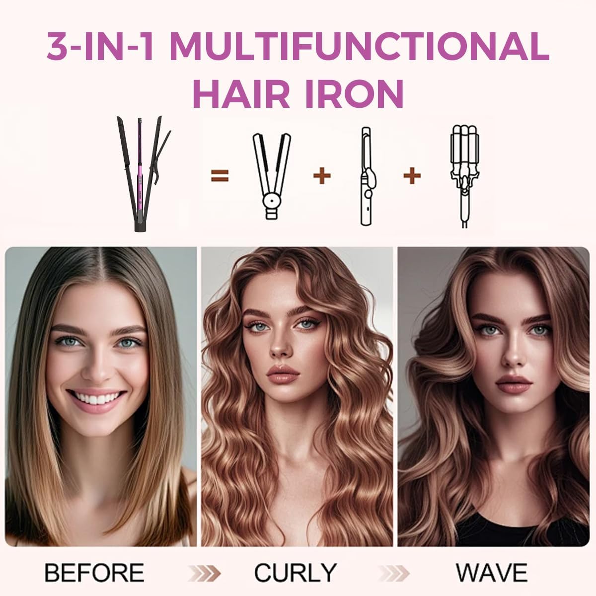 【Smooth Styling with Ceramic Plates & Negative Ions】 This professional 3 in 1 hair straightener, curling iron, flat iron, and hair crimper combines advanced ceramic plates and negative ion technology to deliver ultra-smooth styling results. The ceramic flat iron heats evenly, glides through hair without pulling or snagging, and helps reduce frizz, static, and split ends. Ideal for achieving shiny, silky, healthy hair, this curling iron and straightener combo is perfect for daily styling, travel, or salon-quality results at home.