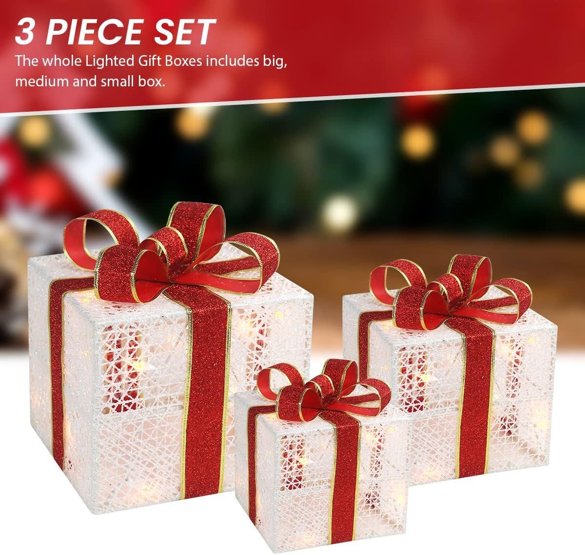 35 LIGHTS – This Christmas Present Boxes Set is pre-lit with 35 warm LED lights (15, 12, and 8), creating a warm and bright display that will delight your visitors.