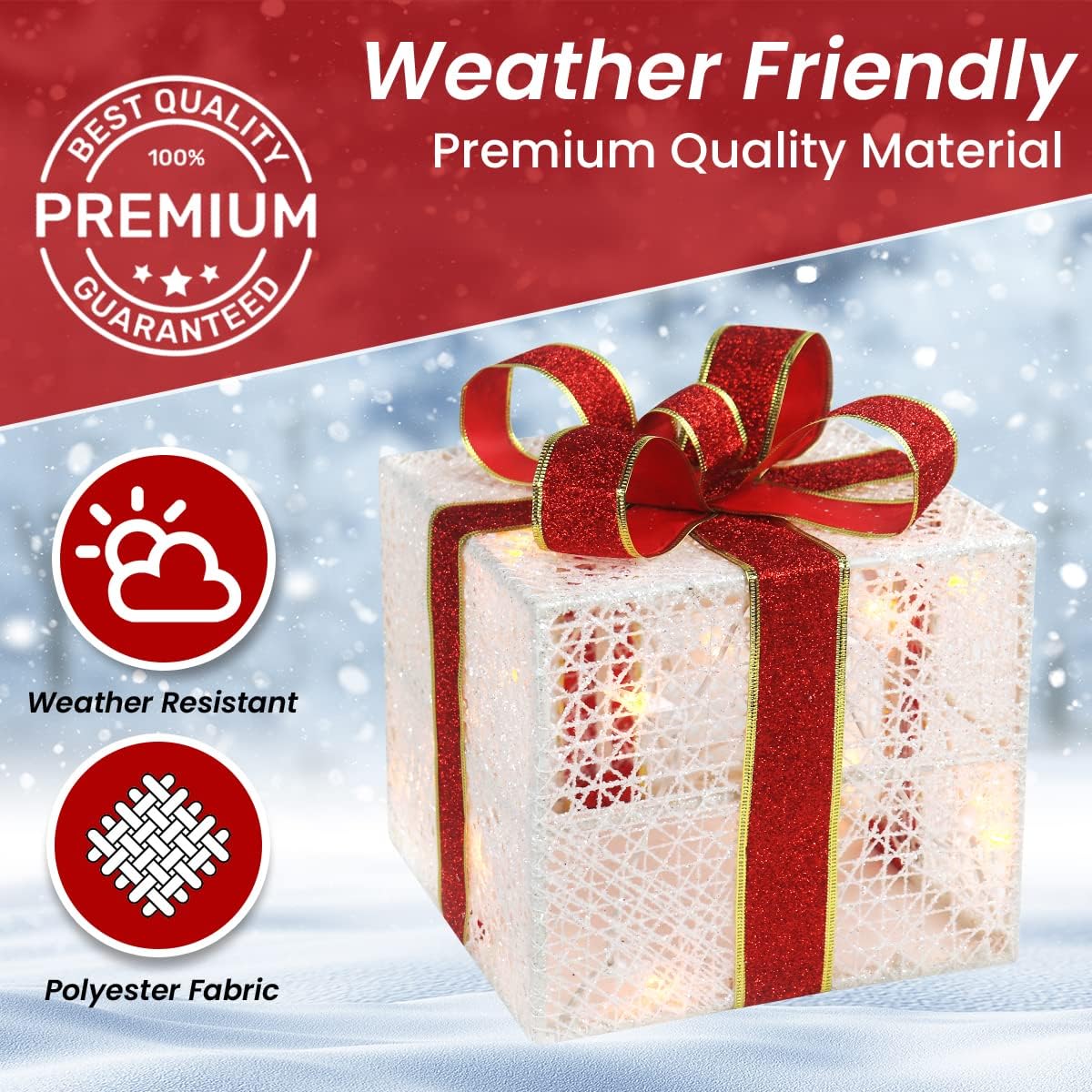 DURABLE AND WEATHER-RESISTANT – Crafted from high-quality materials, this Set of 3 Lighted Gift Boxes is designed to withstand harsh weather conditions, ensuring it remains a beautiful and reliable decoration throughout the holiday season.