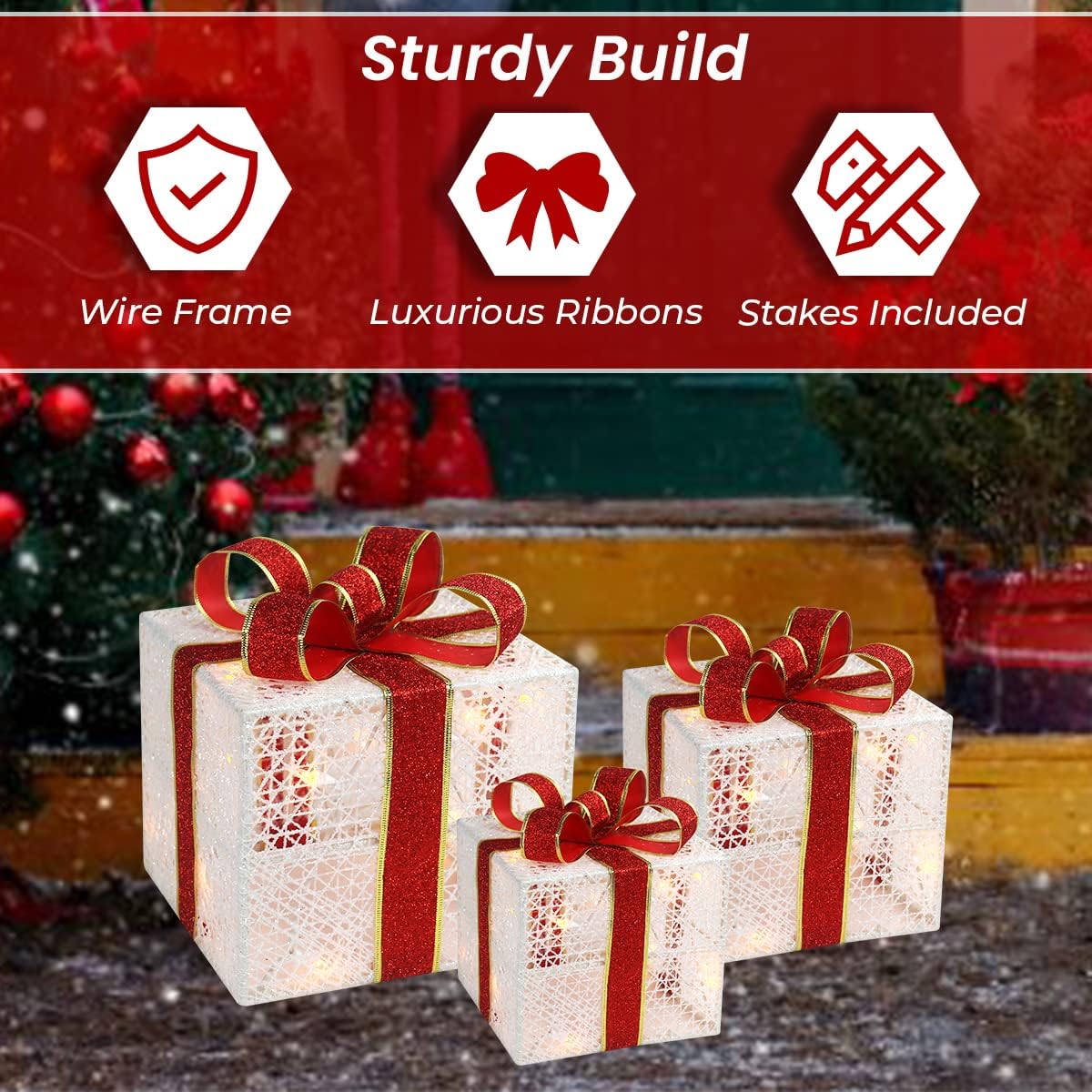DURABLE AND WEATHER-RESISTANT – Crafted from high-quality materials, this Set of 3 Lighted Gift Boxes is designed to withstand harsh weather conditions, ensuring it remains a beautiful and reliable decoration throughout the holiday season.