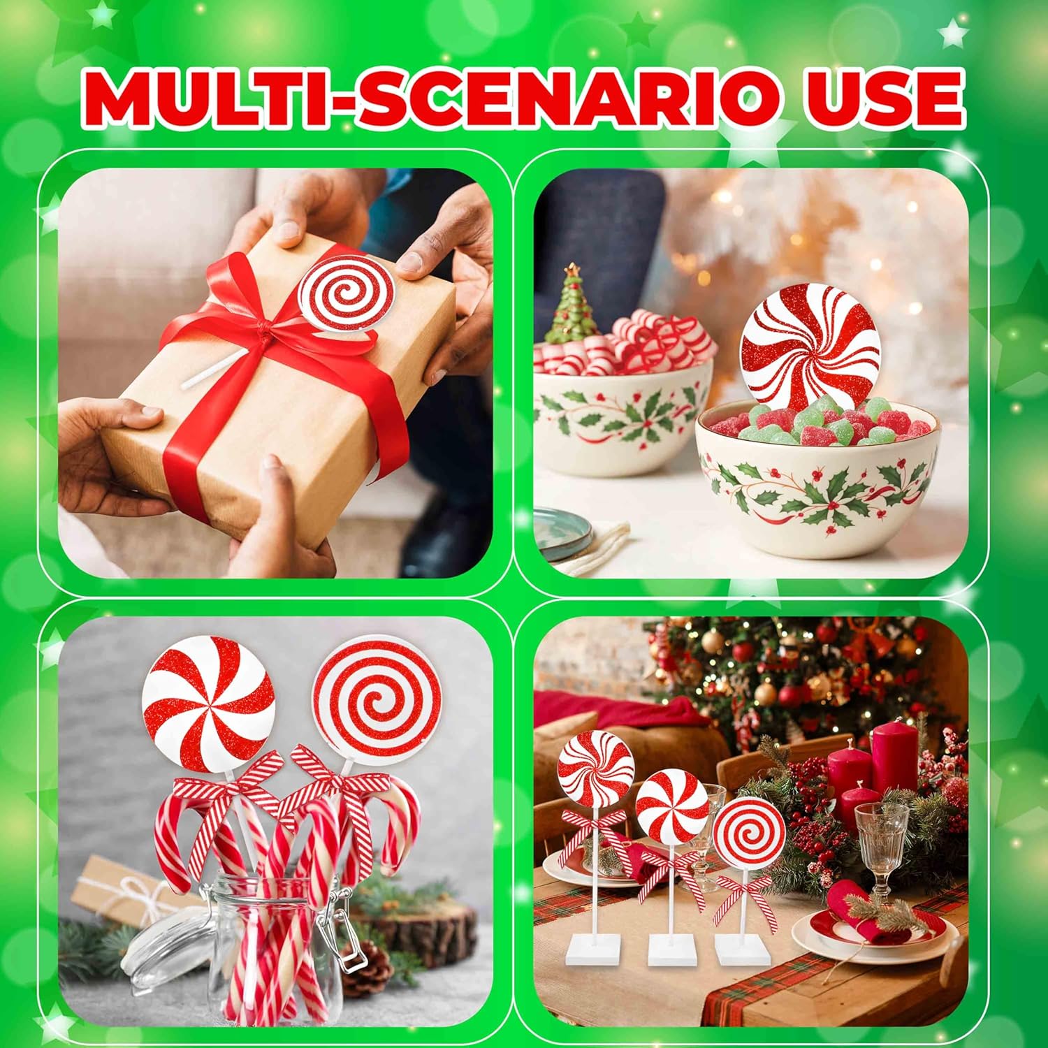 Set of 3 candies in 3 cute red & white pepper mint candy cane designs that are inserted on a white stick with a bow and then placed in a base; it’s easy to pop on any table top, desk, shelf or counter