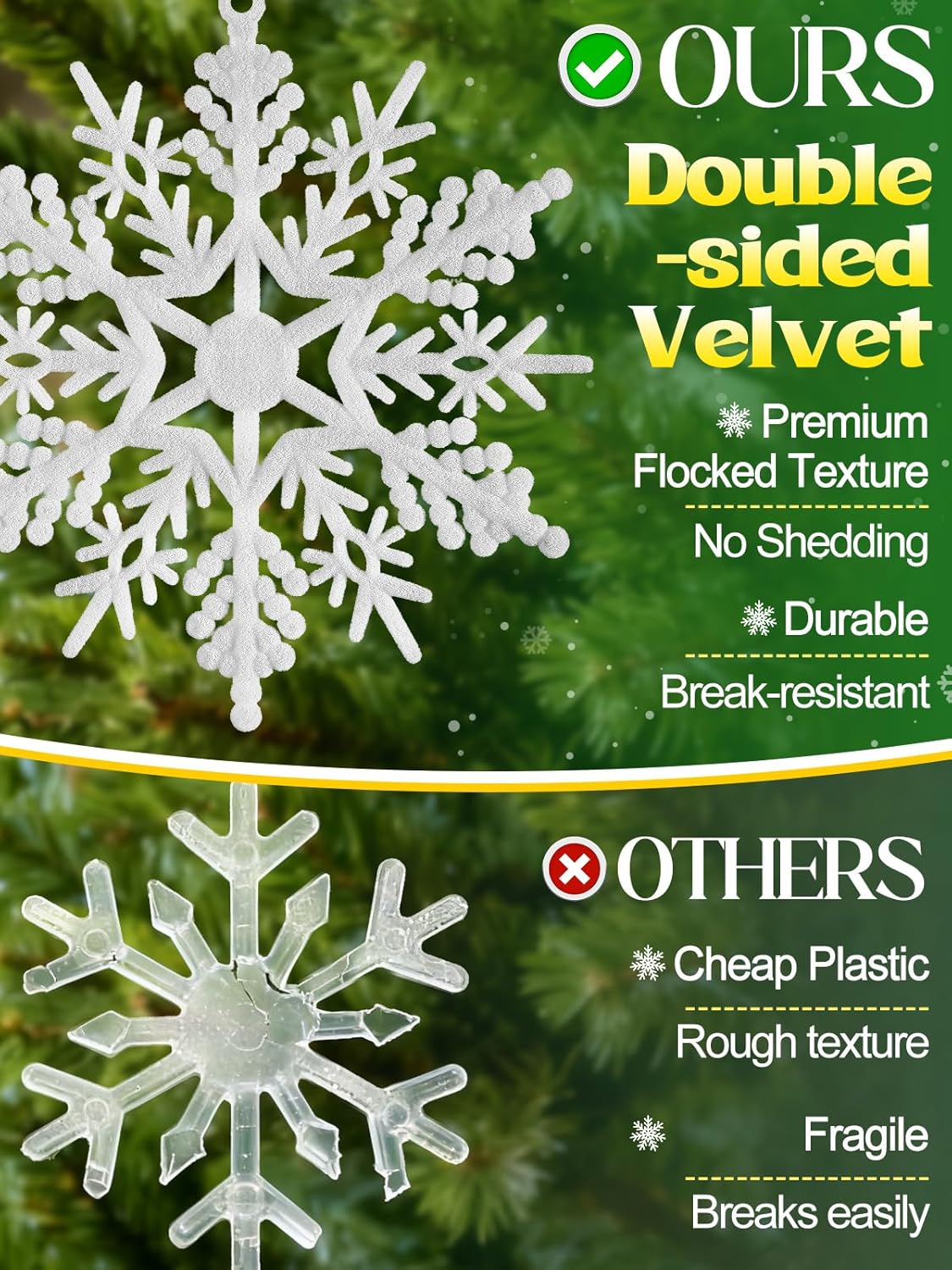Double-Sided Flocked Velvet: Crafted with double-sided flocked velvet, these white snowflake ornaments offer a soft, luxurious texture that won’t shed or fade. Unlike ordinary plastic ones, they are durable and add an elegant winter charm to your holiday décor