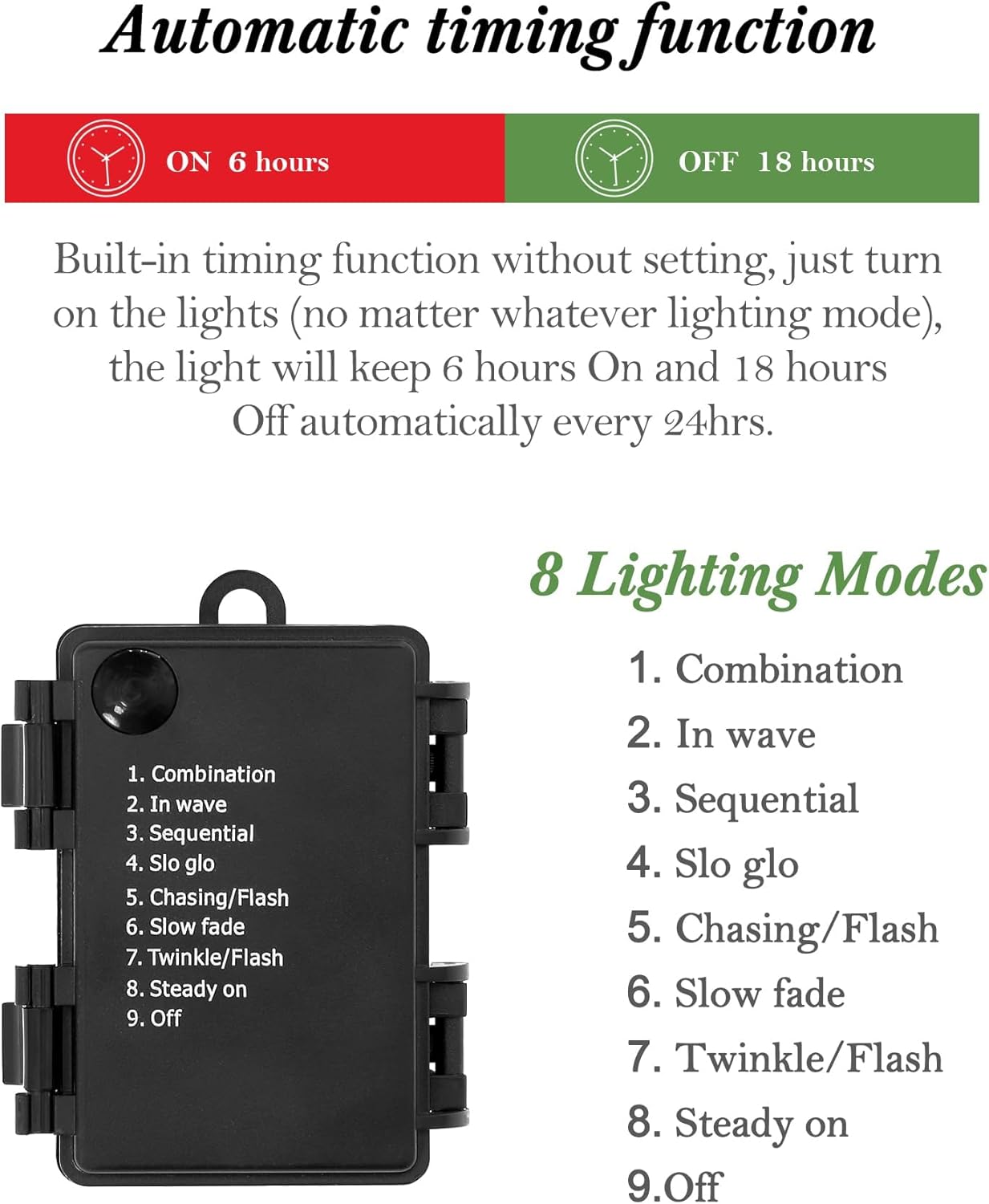 【Timer Setting】The battery box with 70 LED lights on this Christmas tree string comes with a timer function that automatically turns off 6 hours after turning on and stays off for 18 hours. Set it to turn on at the same time every day, saving energy in the early morning and bringing a cozy effect at night, freeing your hands.
