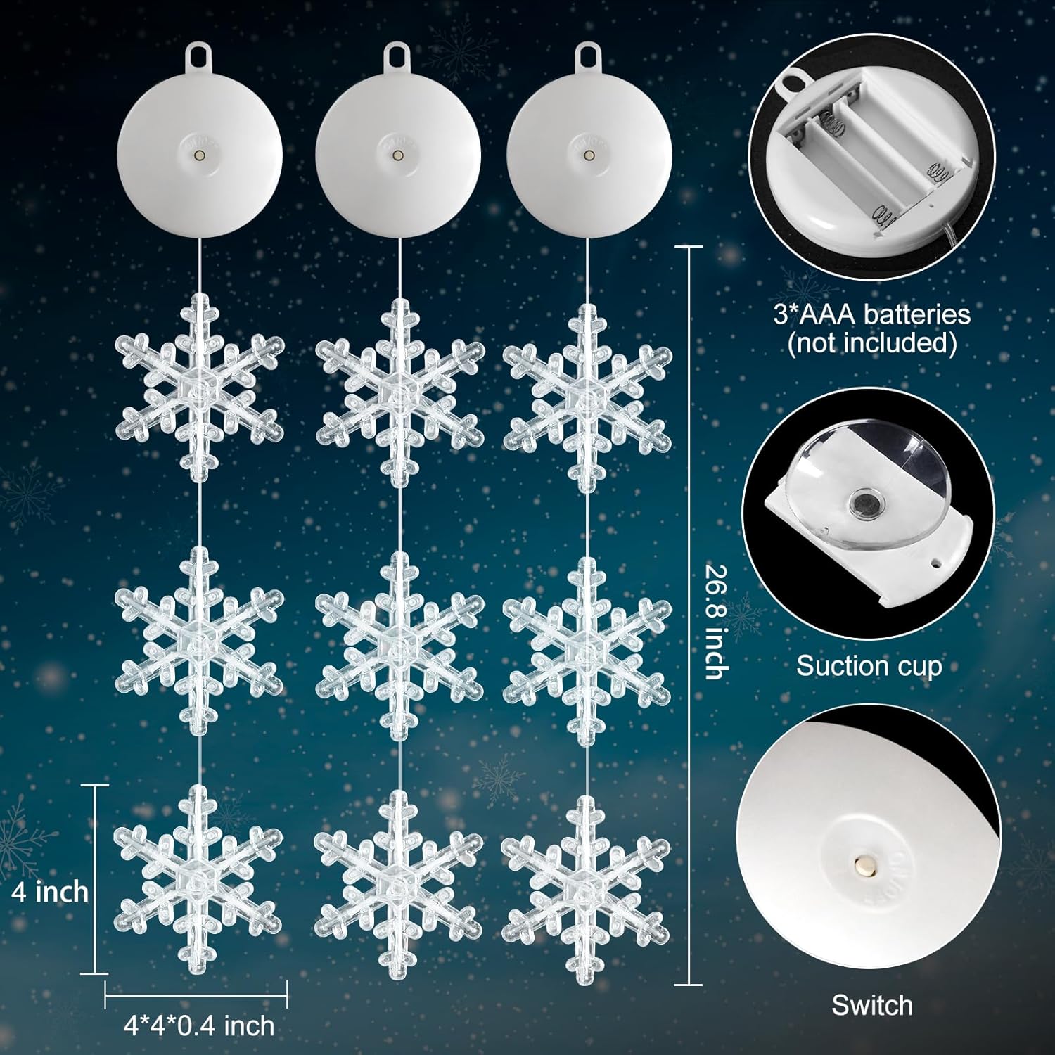 3Pack Christmas Window Lights Decorations with Timer, Battery Powered Christmas Hanging White Lighted Snowflake Shaped LED Sucker String for Xmas Tree Fireplace Indoor Decor