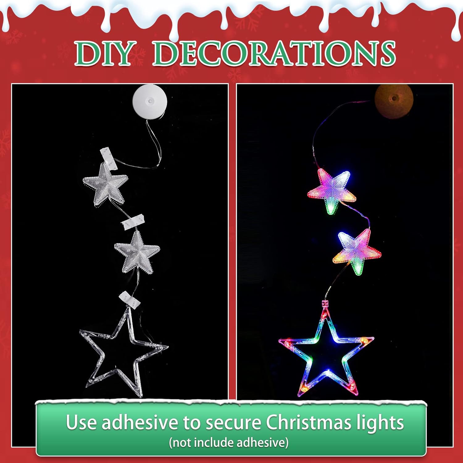 🌟【EASY TO USE】 : the window decoration light comes with a suction cup, which can be easily installed on glass, gates, cabinets, etc., and the height can be adjusted according to the fixed position and press the ON/OFF button on the battery compartment to turn on/off the lights (Lighting Mode: Steady on, Twinkling).make sure that the suction cup is clean before installation, adding appropriate water to increase the adhesion.