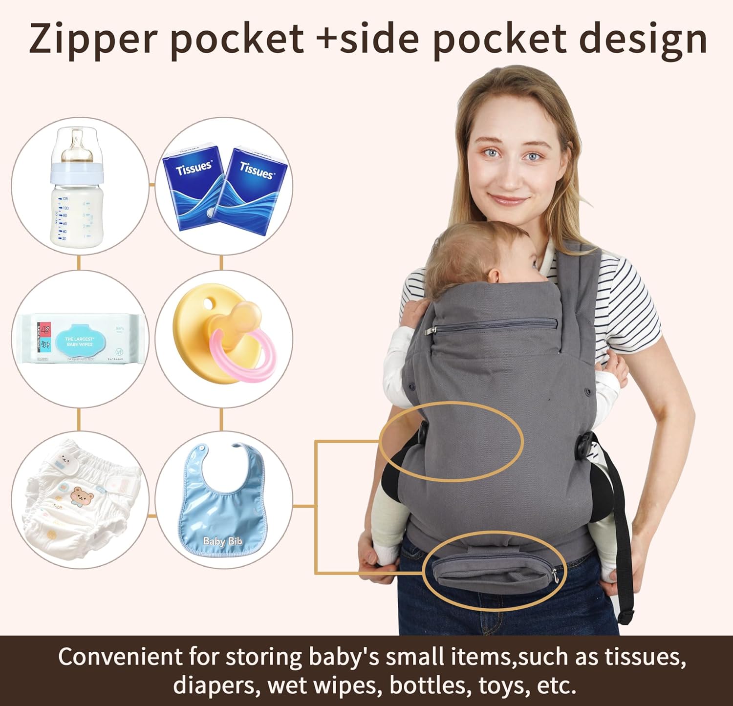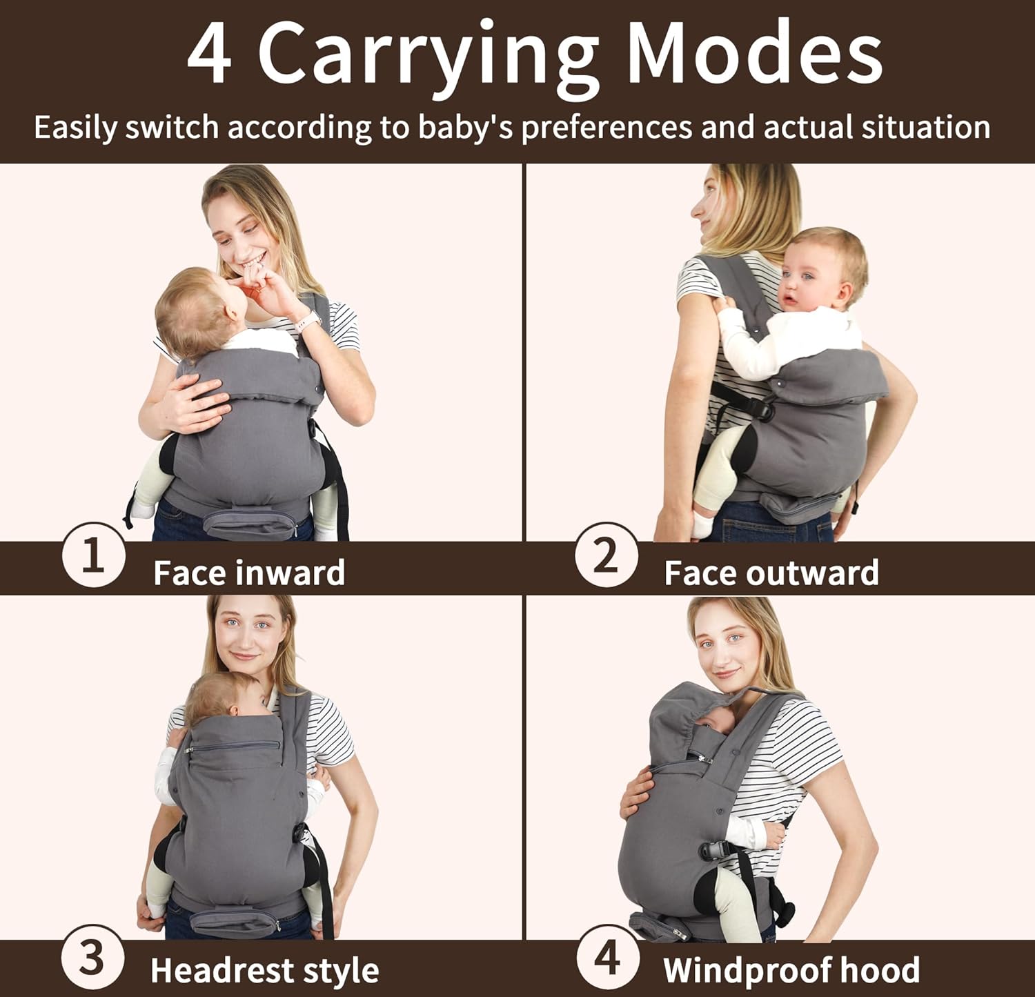 4-in-1 carrier: Convertible baby carrier with 4 carrying styles: in-face, out-face, hood, and headrest. Ergonomically designed for all stages from newborn to toddler (7-45 lbs), multiple options allow you to flexibly cope with various situations.