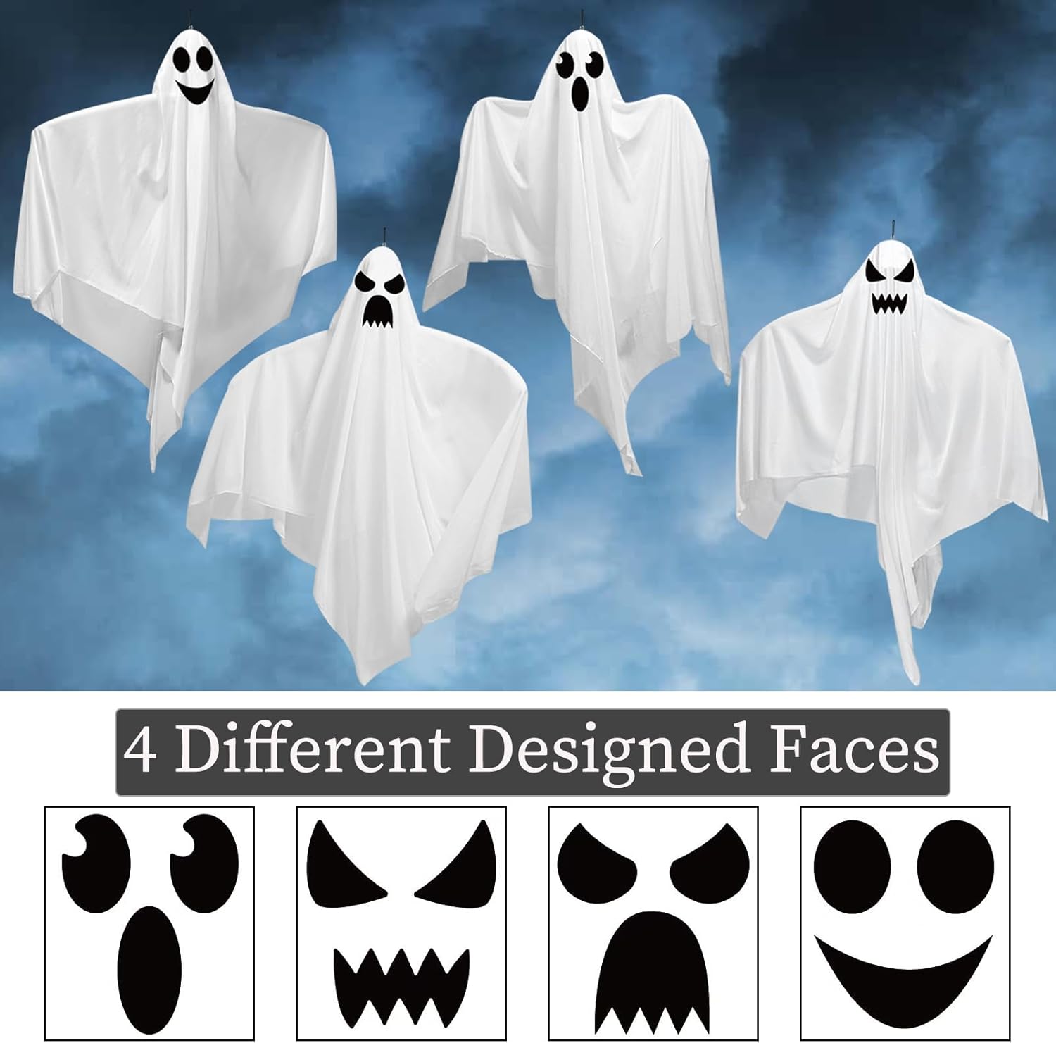 Super Value Set: Package includes 4 pack Halloween hanging decorations with 4 different cute but horrible ghost expressions, add variety and our cute halloween hanging decorations will add more fun to your Halloween. They can easily add mysterious and scary atmosphere to your home and make your Halloween night more memorable
