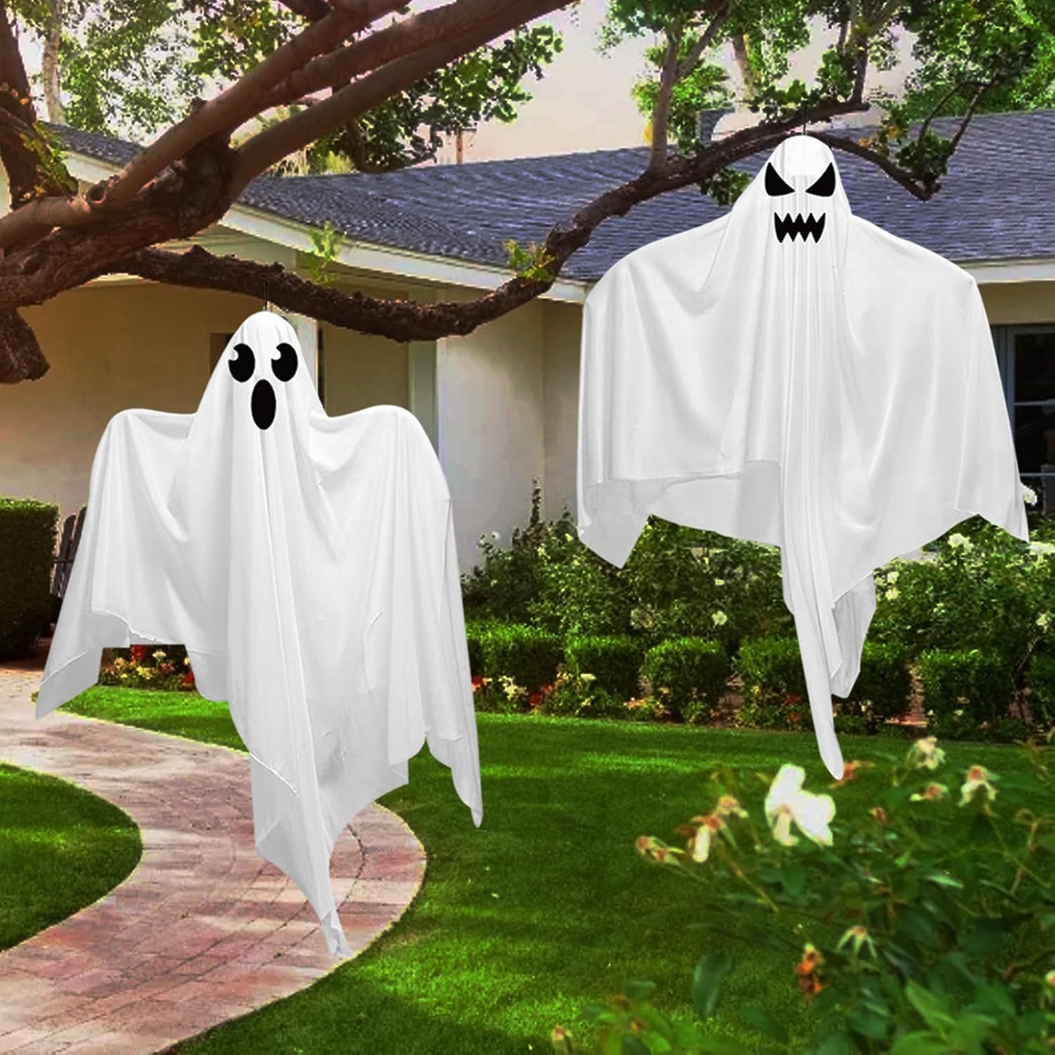 Easy to Install: Our white ghost decorations’ arms are flexible, and you can bend and adjust them into different positions according to your needs. The top of each flying ghosts has an elastic thread that you can simply hang these floating ghosts up anywhere, suitable for both indoor and outdoor Halloween decorations