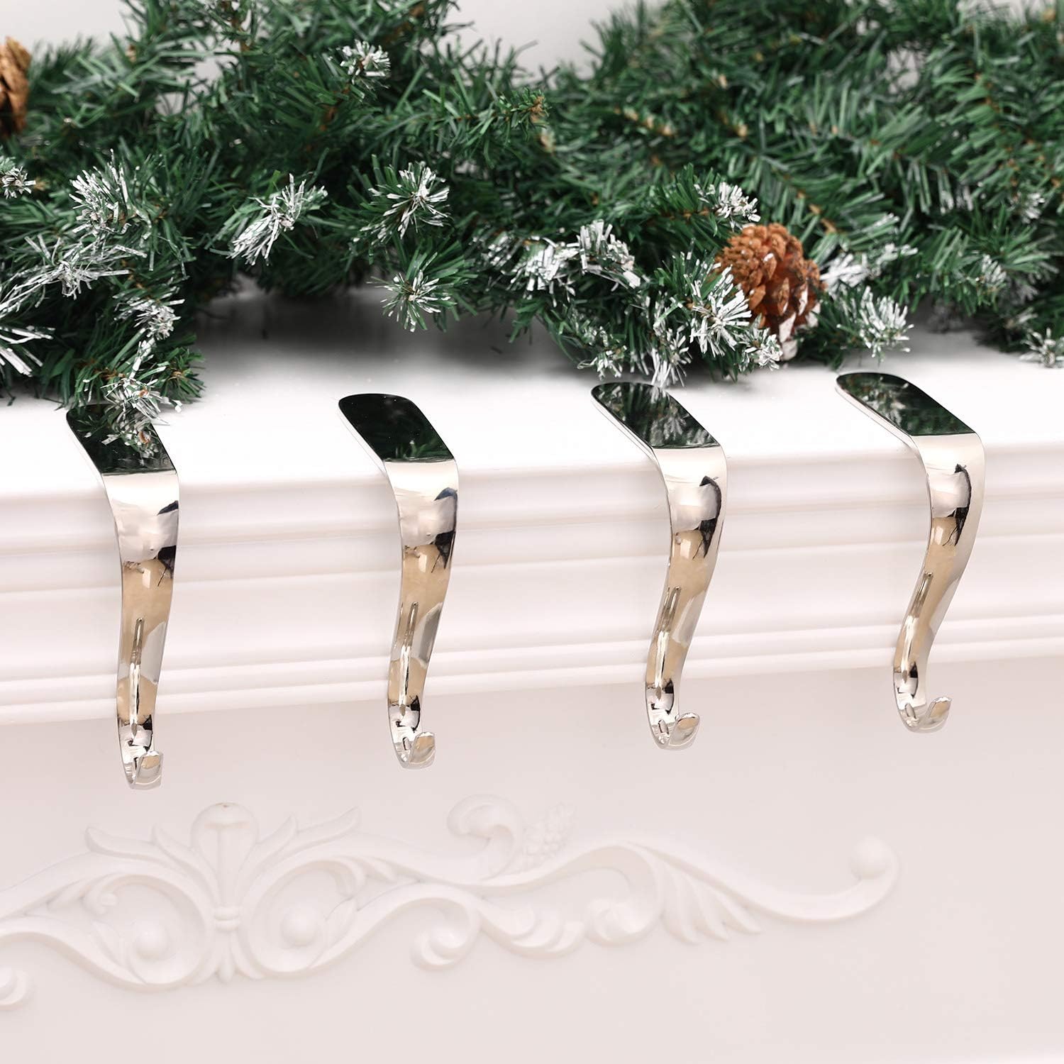 1、Package: including 4 pieces stocking hooks in silver color, packing with a box, keep these Christmas stocking hangers clean and tidy.