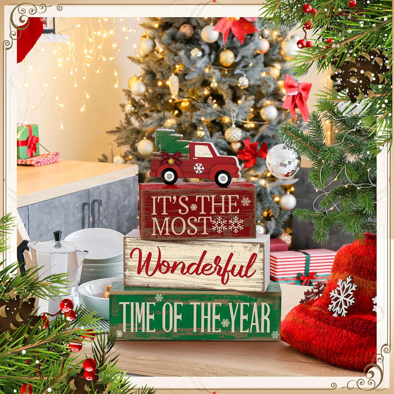 Red Truck Tiered Tray Decorations: christmas tiered tray decor set is designed in the shape of a classic red truck with Christmas tree sign and books, come with 4 wooden signs, 1 truck sign and 3 wood decoration books; Vibrant Christmas centerpieces are suitable for Christmas parties and home to welcome the holiday