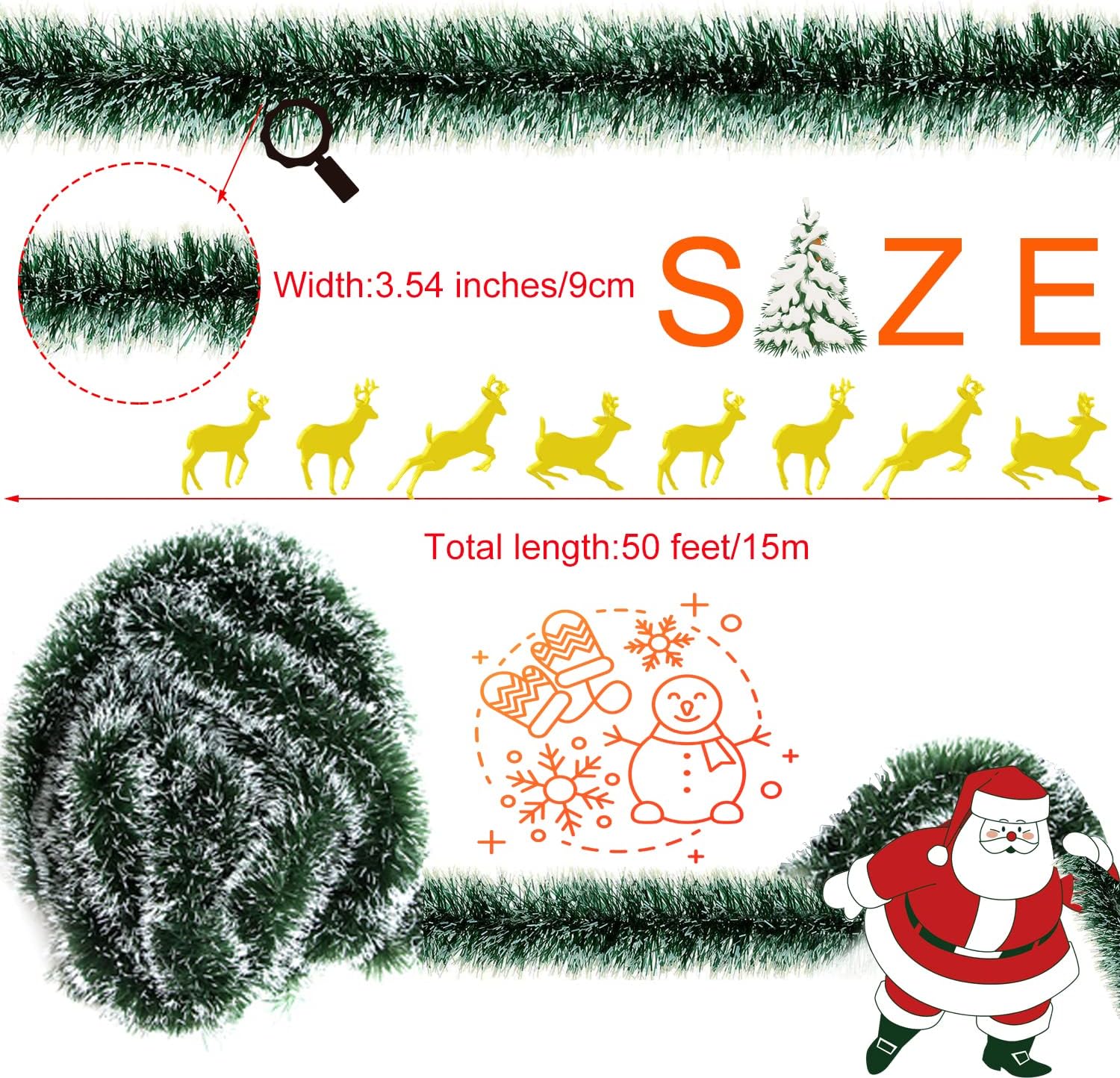Package Include:50 feet/15 m long artificial Christmas wreath,long enough for decoration;width of hanging ceiling decoration is 3.54 inches/9 cm