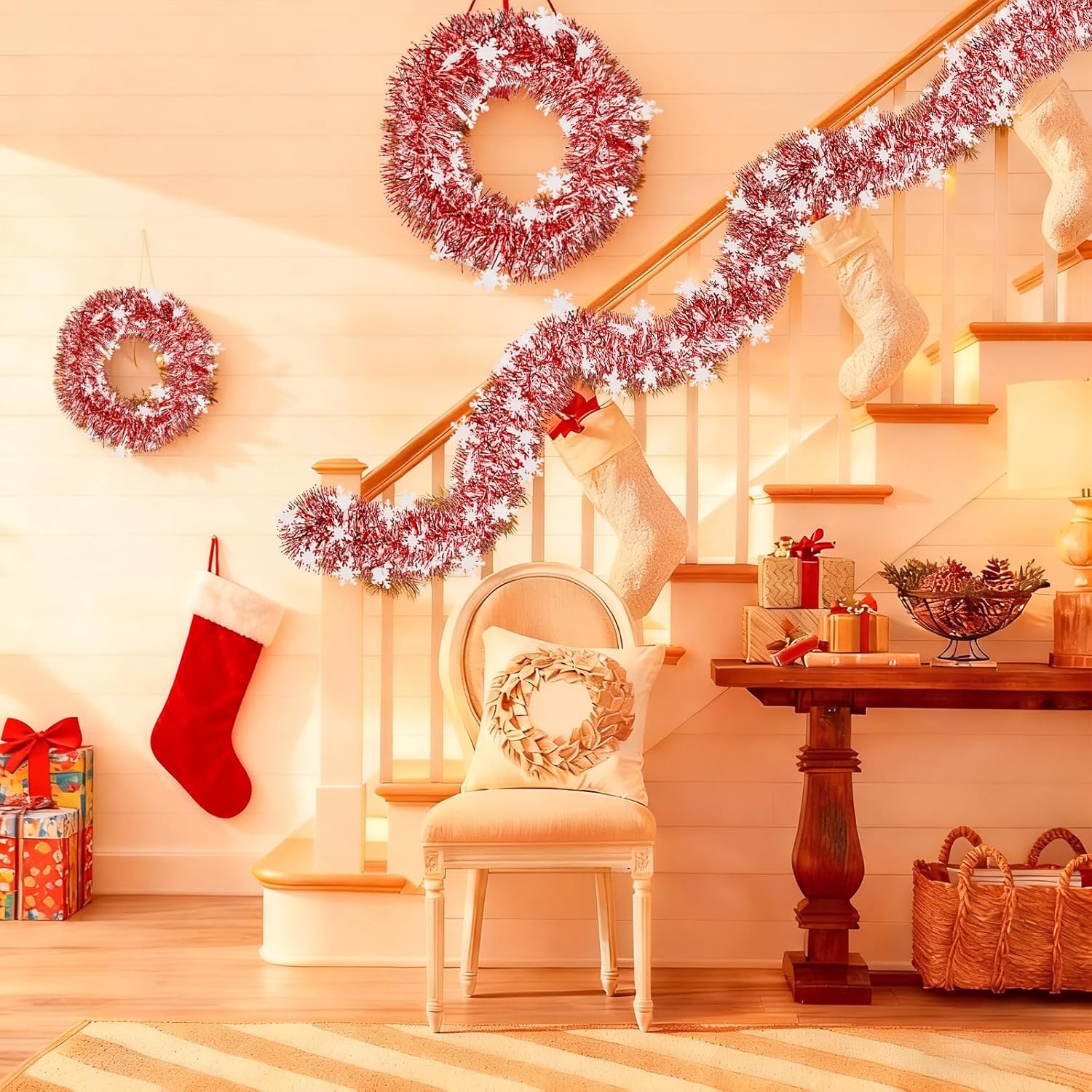 50Ft Christmas Tinsel Garland, Red and Snowflake Tinsel Garland Metallic Twist Shiny Garland for Xmas Tree Decorations, Tinsel for New Year Party Ceiling Hanging Decorations Indoor and Outdoor Decor