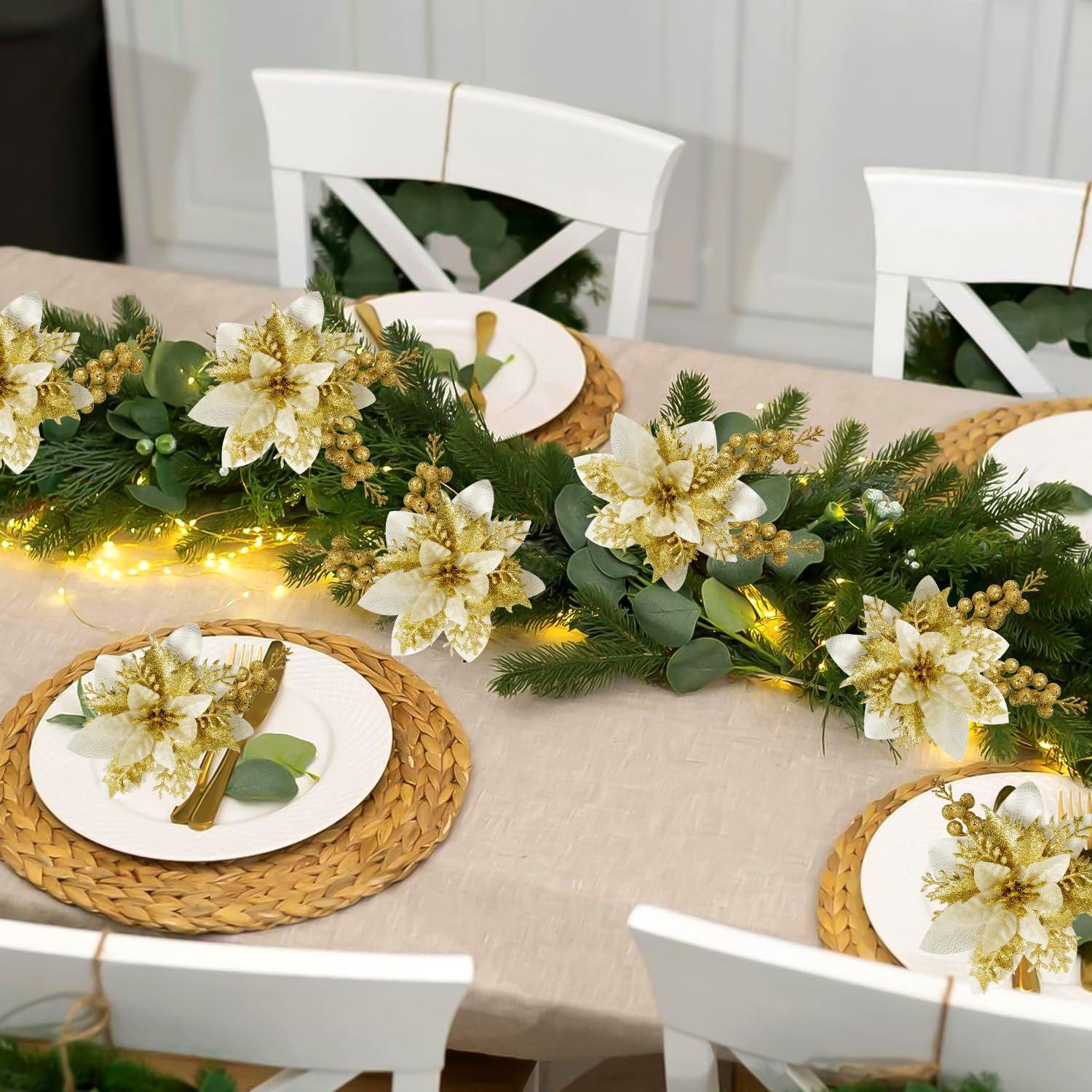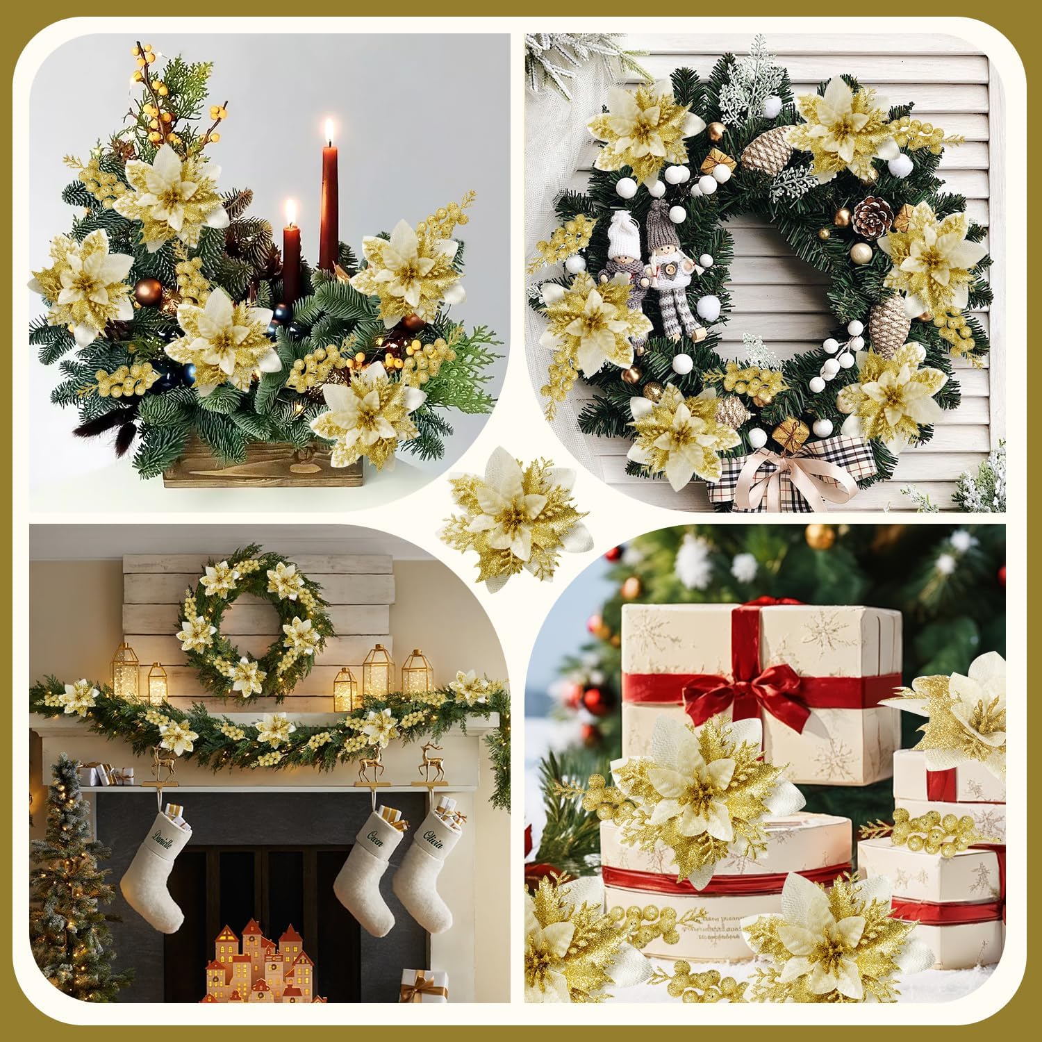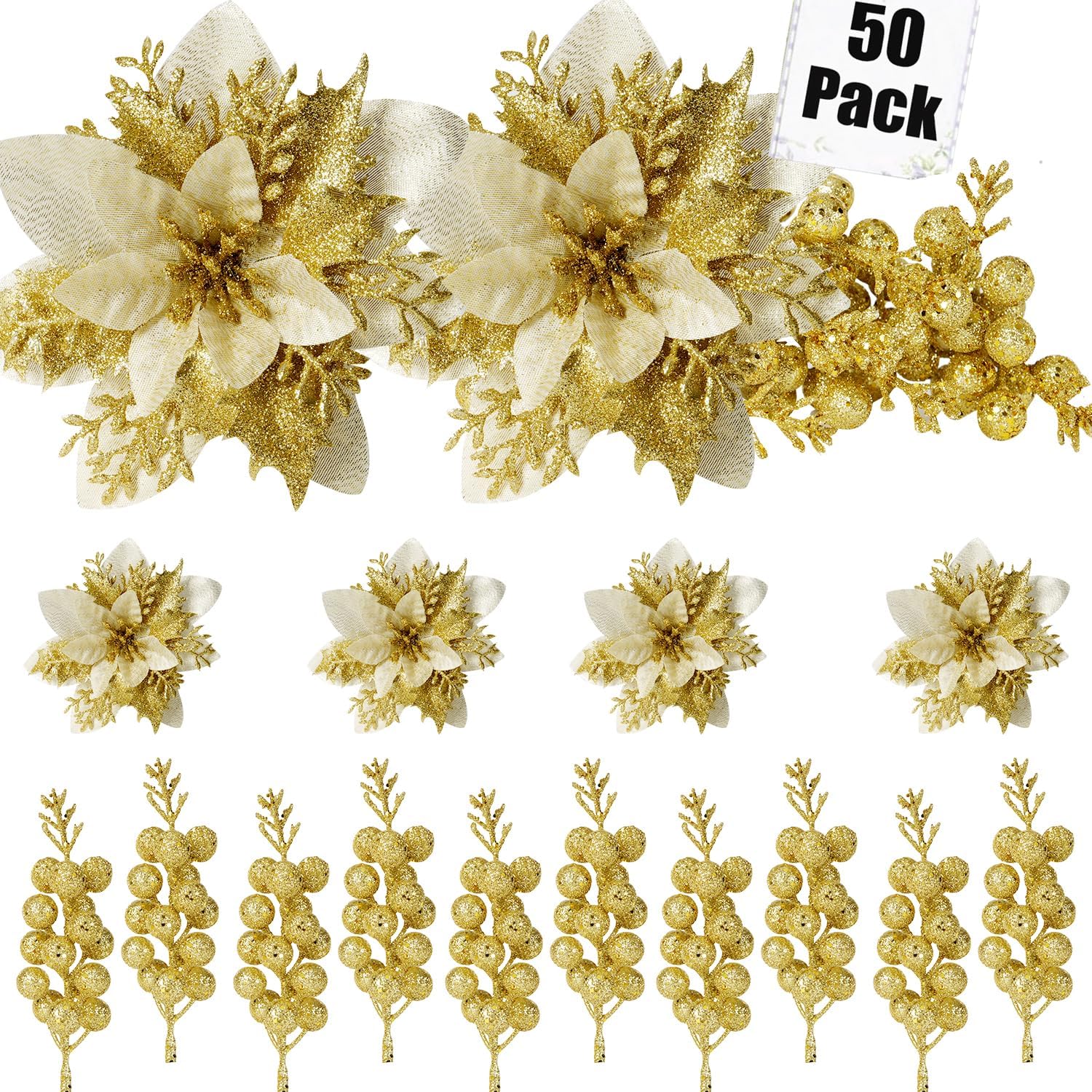 50pcs Glitter Poinsettia Christmas Ornaments, Artificial Flowers with Clips Stems for DIY Wreath Making, Holiday Home Party Decorations, Indoor Use (Gold)