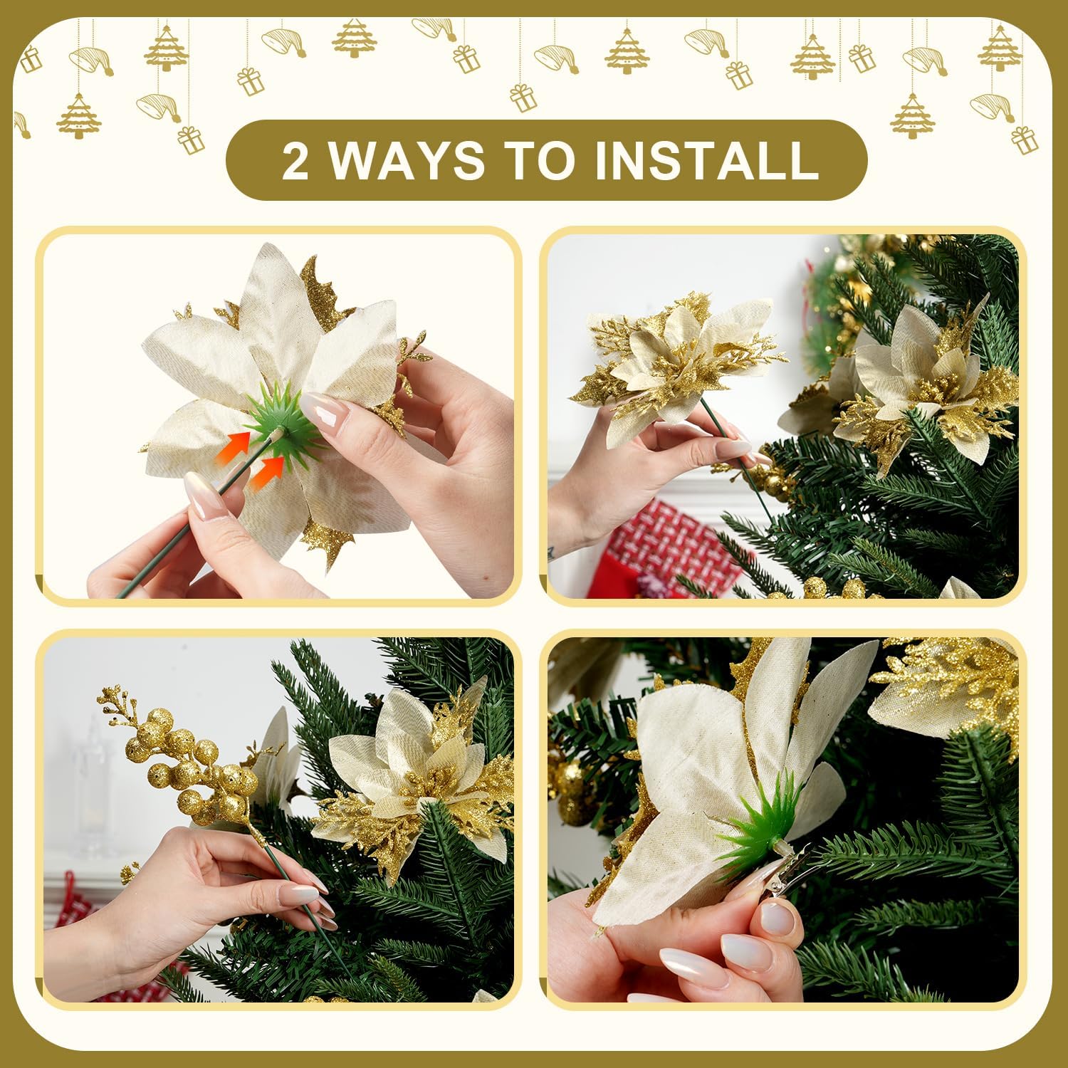 PACKAGE CONTENTS: Set of 25 artificial poinsettia flowers with glittery sliver petals and 25pcs Christmas Glitter Berries, complete with built-in clips and flexible stems for versatile decorating