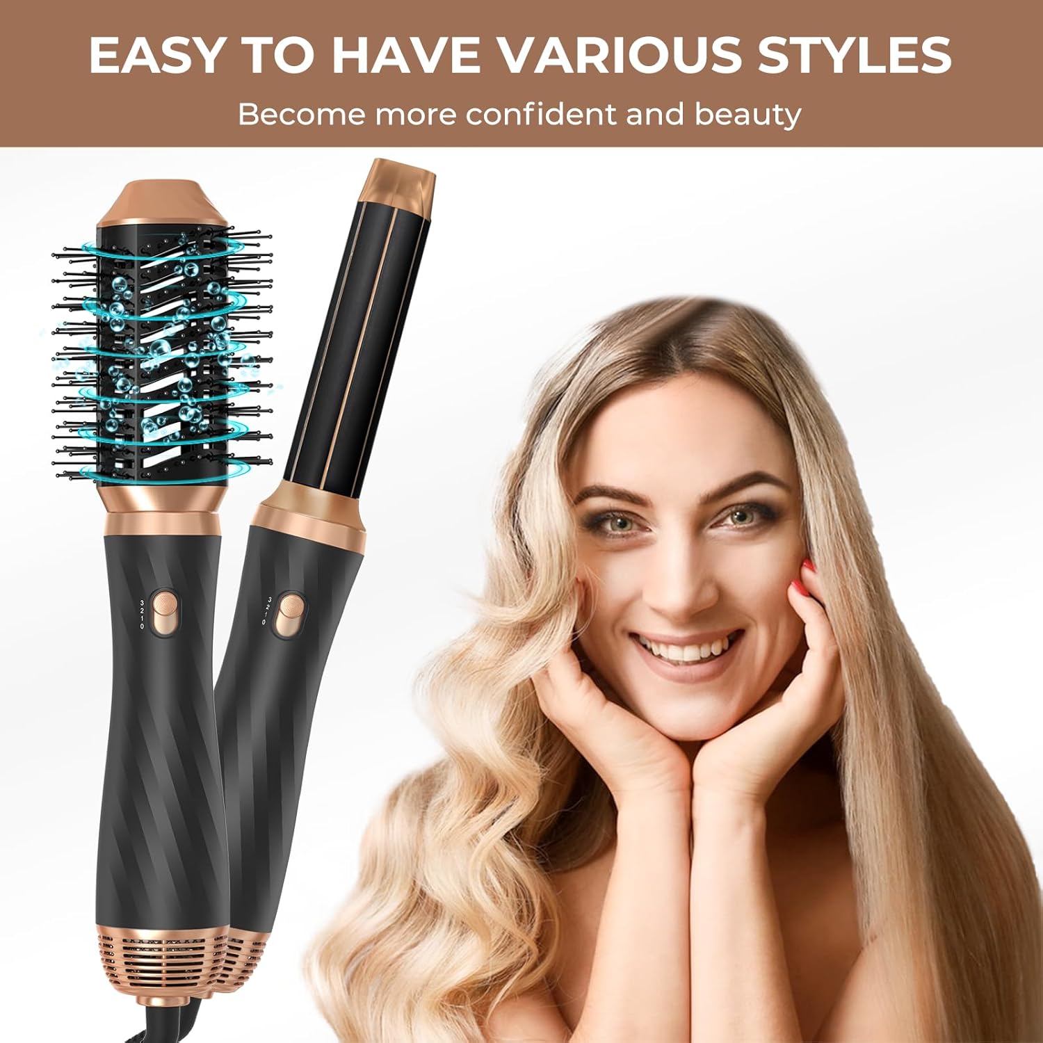 6 IN ONE BLOW DRYER BRUSH FOR WOMEN: Multifunctional hair dryer brush allow you easily become your own stylist and create various styles you want. Hair dryer brush set includes 1*hair dryer, 1*hair straightening brush, 2*left right hot air curler, 1* Styling Brush for straightening and volumizing, 1*Massage hot air brush for daily combing , 1* heat-resistant glove. It is easy to change brush heads just by pressing the button.