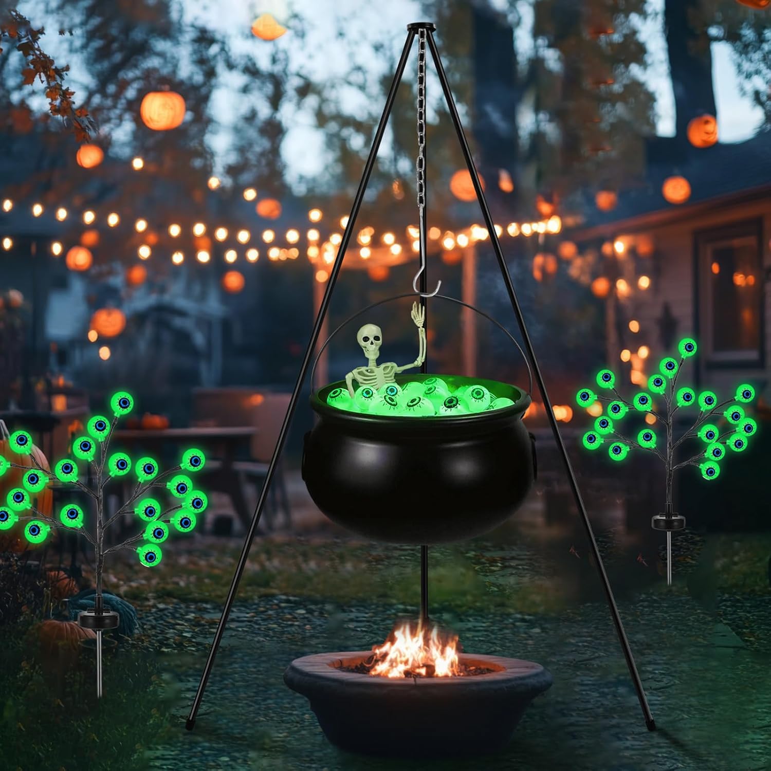 Halloween Yard Decorations: this Halloween decorations outdoor include a large witches cauldron with a 51 inch tripod with chain, a poseable skull, a string of eyeball lights and spiderwebs, 3 pcs 6 ft lighted witch stakes, and 2 pcs solar eyeball lights; It’s nice for transforming your yard, garden, or porch into a haunted Halloween wonderland