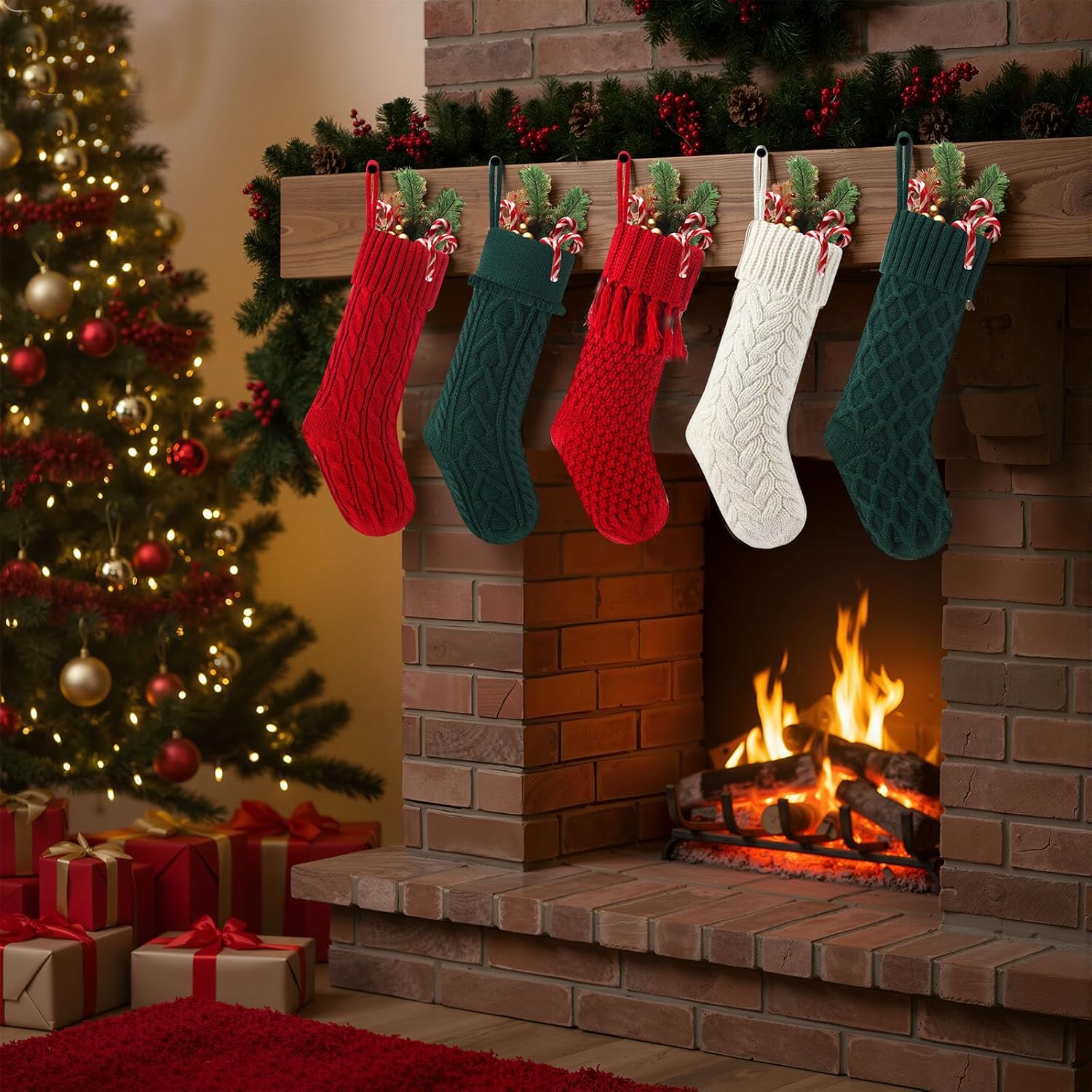 Christmas decorations: Packages include 6 pcs 18-inch cable knit Christmas stockings in assorted handmade patterns. The Christmas tones and rustic texture complement farmhouse, boho, and minimalist Christmas styles. A great addition to holiday and seasonal decor