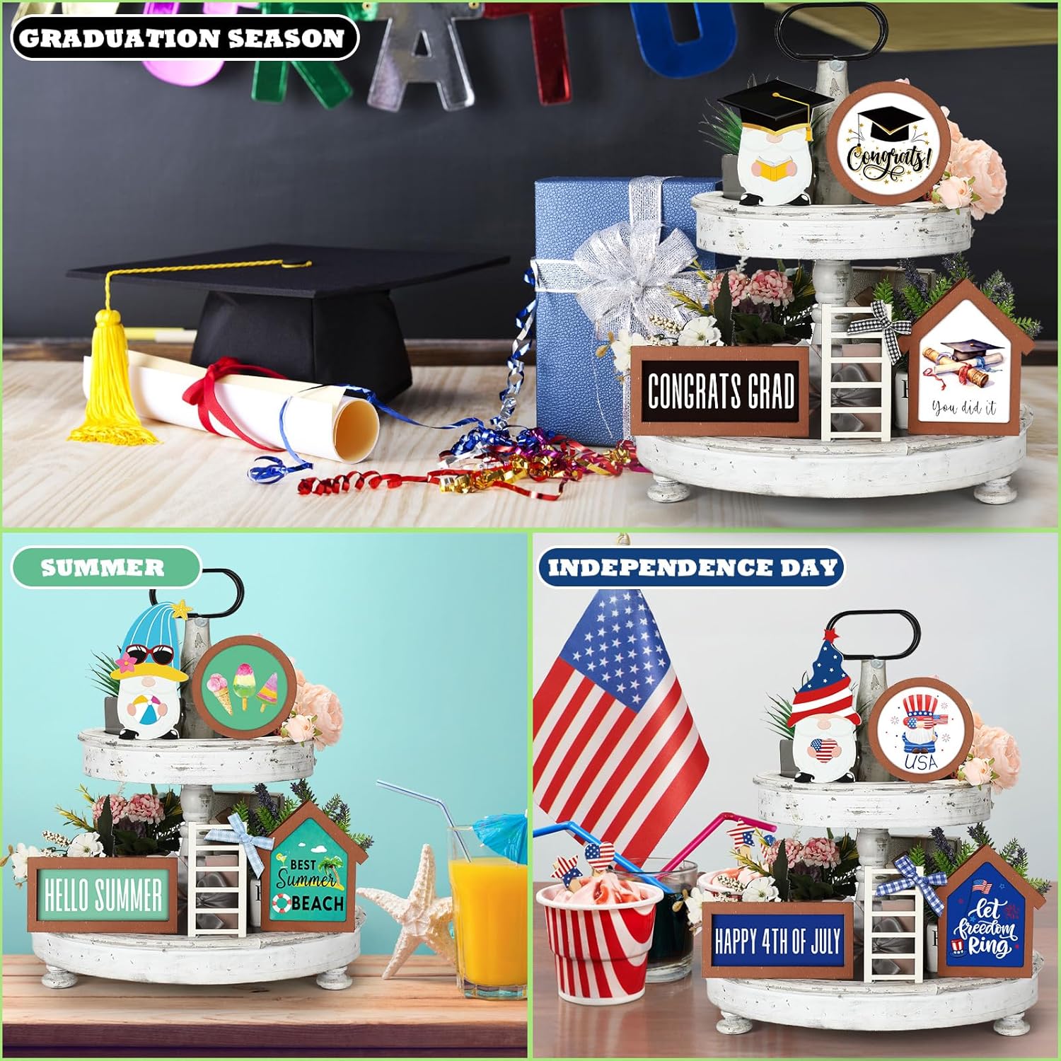 Interchangeable Designs: easy to switch out decorations for seasonal changes, our interchangeable tiered tray set has 12 seasonal card prints to accompany you through every wonderful holiday, such as Valentine’s Day and St. Patrick’s Day, Easter, Spring, graduations, July 4th, Summer and Fall decorating to Halloween and Christmas, as well as some other popular home designs