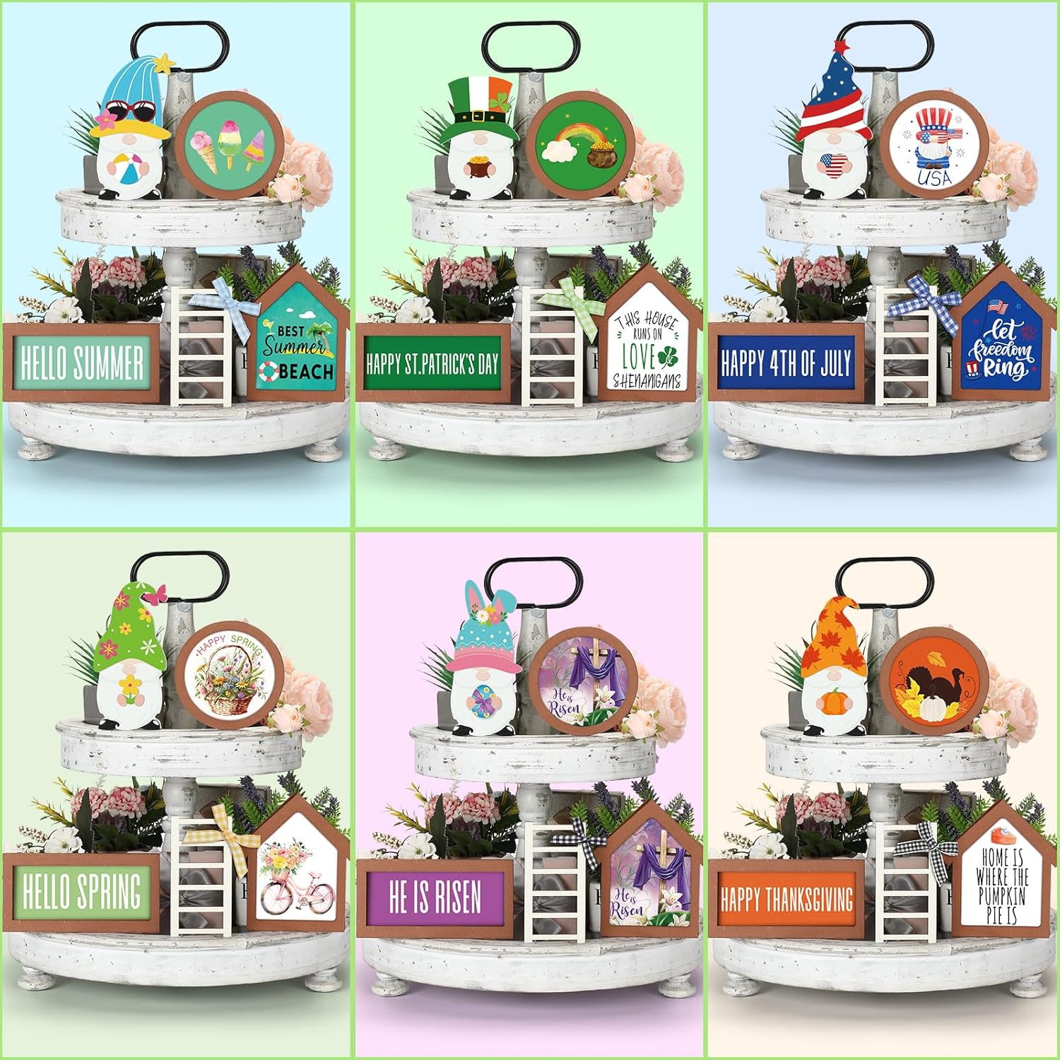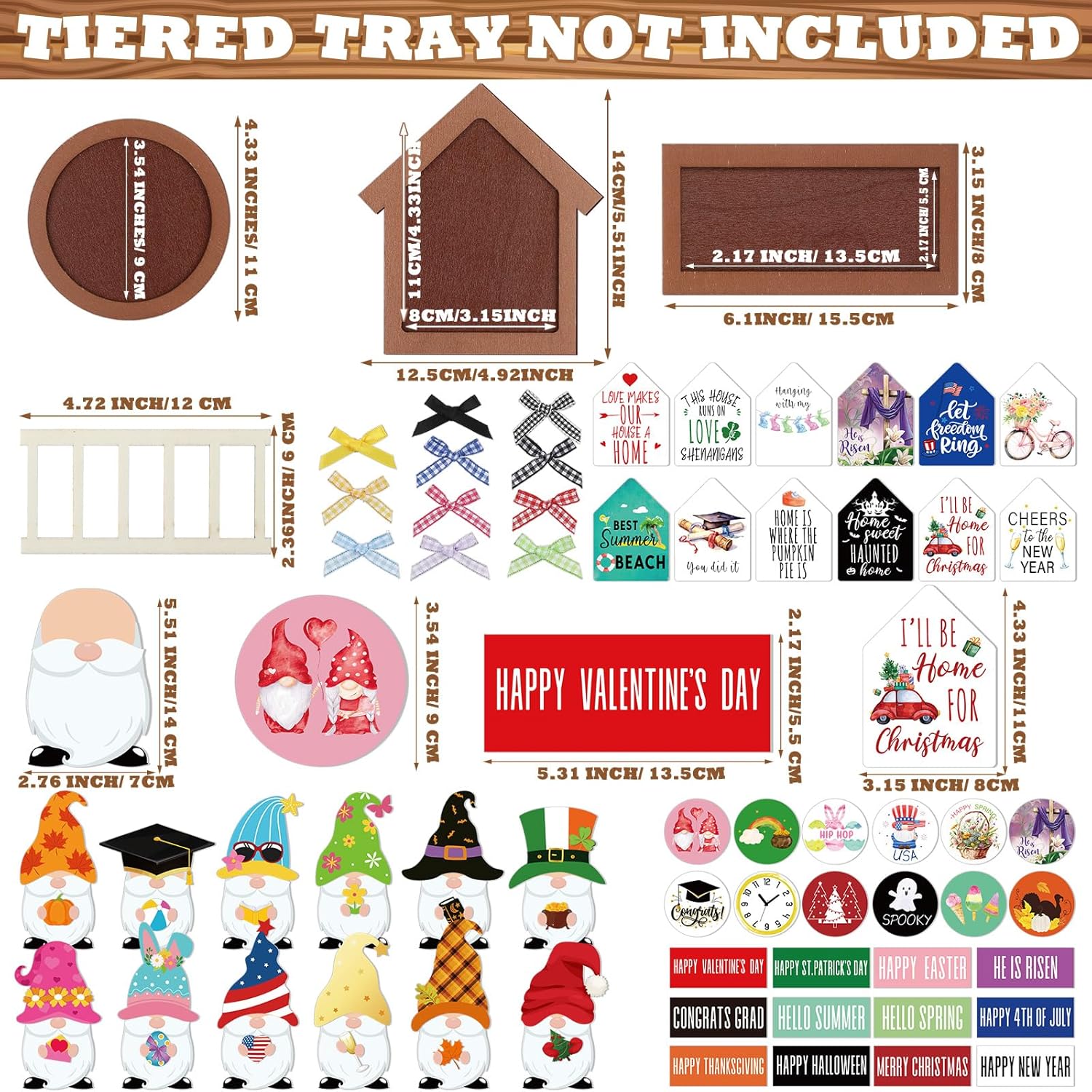 Interchangeable Seasonal Decor Set: the package includes 65 pcs seasonal tiered tray decorations set, containing 1 house frame, 1 rectangular frame, 1 round frame, 1 ladder, 1 gnome ornament, 12 gnome replacement parts, 36 cards, 12 bow knots in different colors (please note that the package does not include a tiered tray), enough quantity to meet your all year round home decoration needs