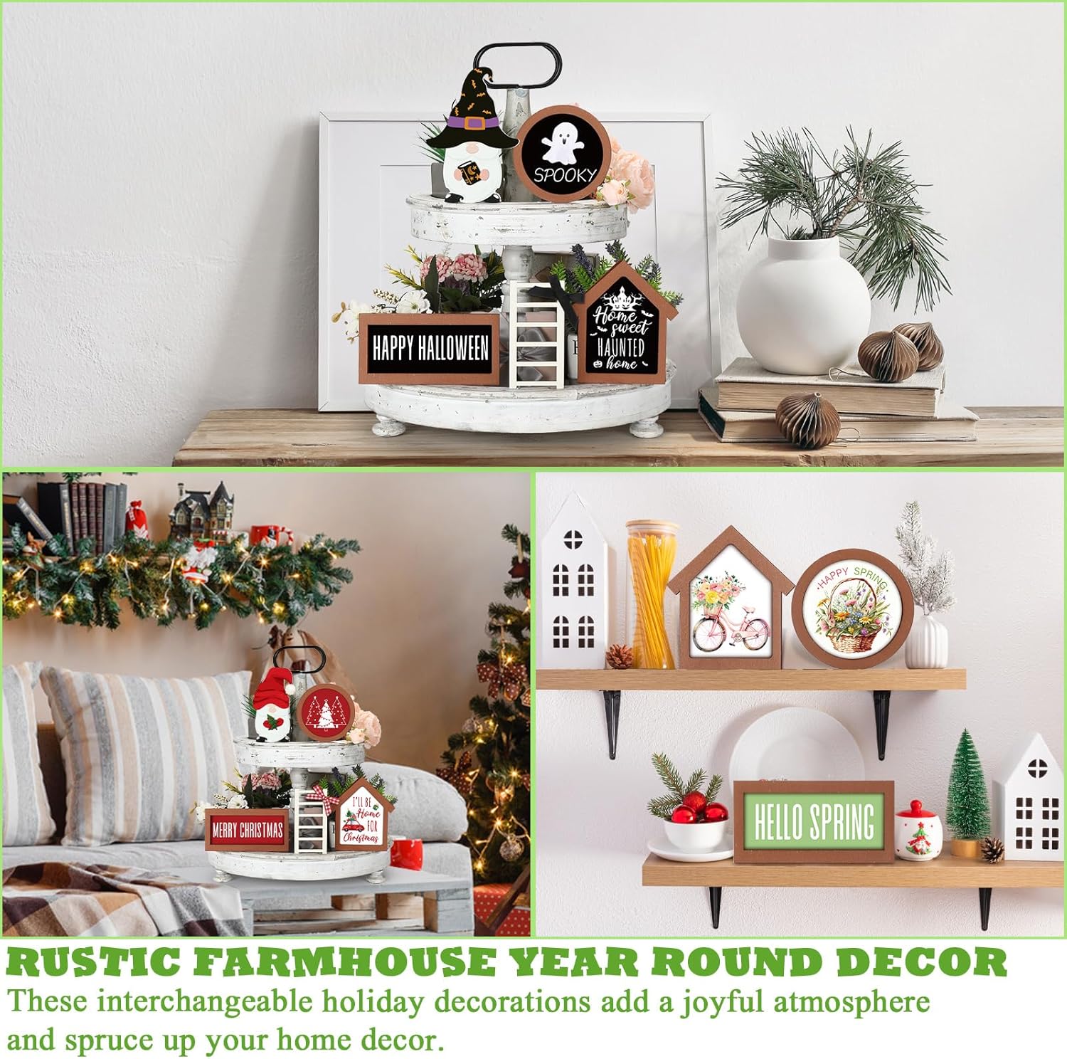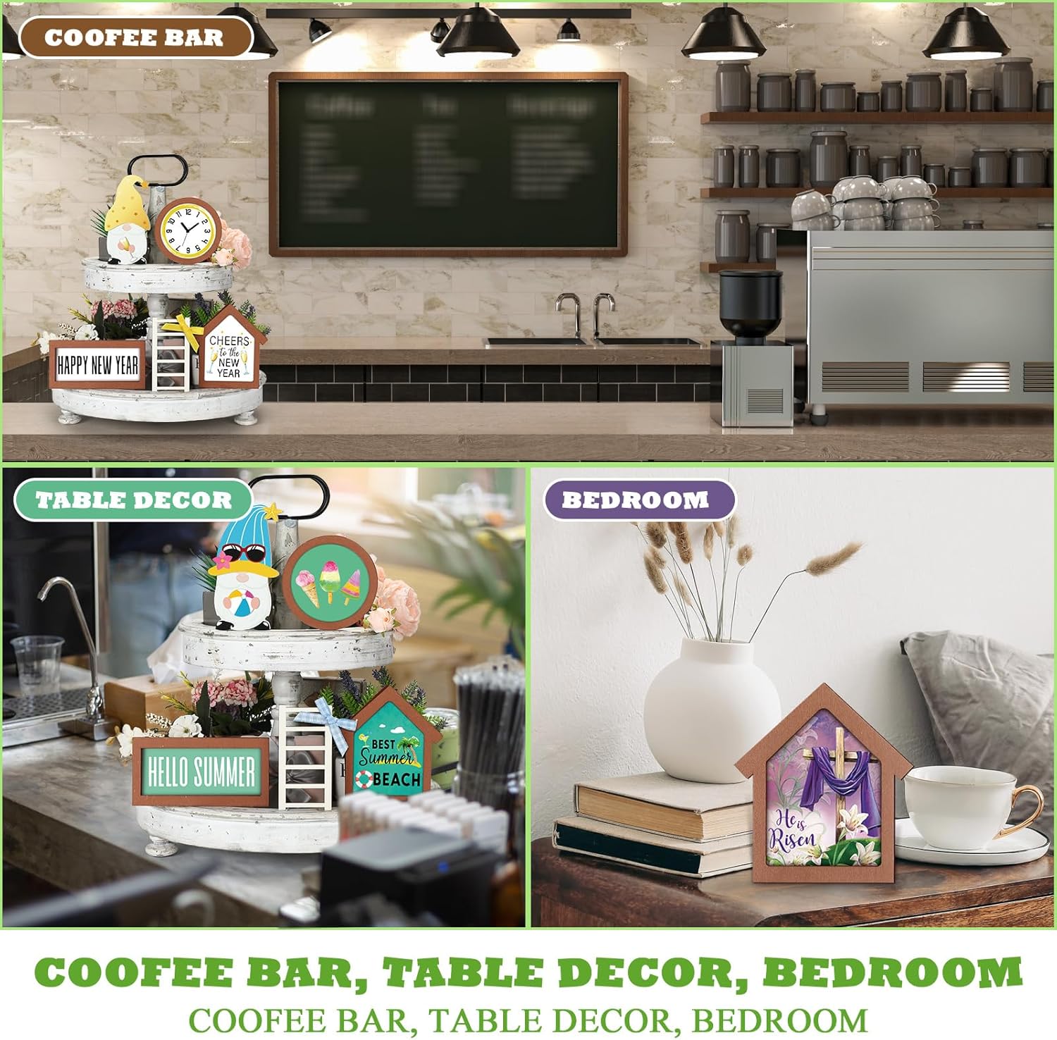 All-in-one set with multiple holiday themes, our tier tray decorations set is primarily applied in homes, dining areas, coffee bars, tables, desks, mantel, and more.
