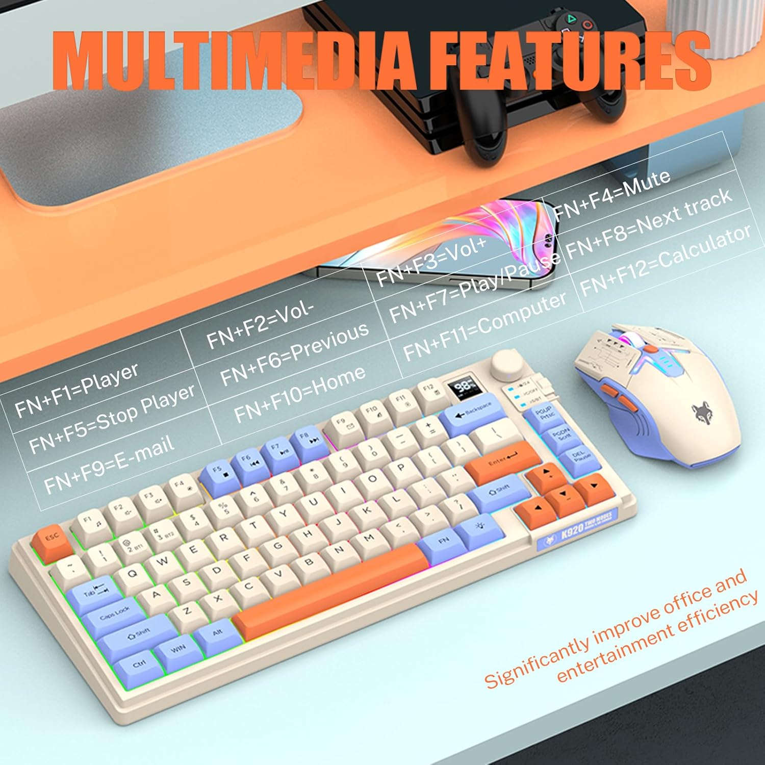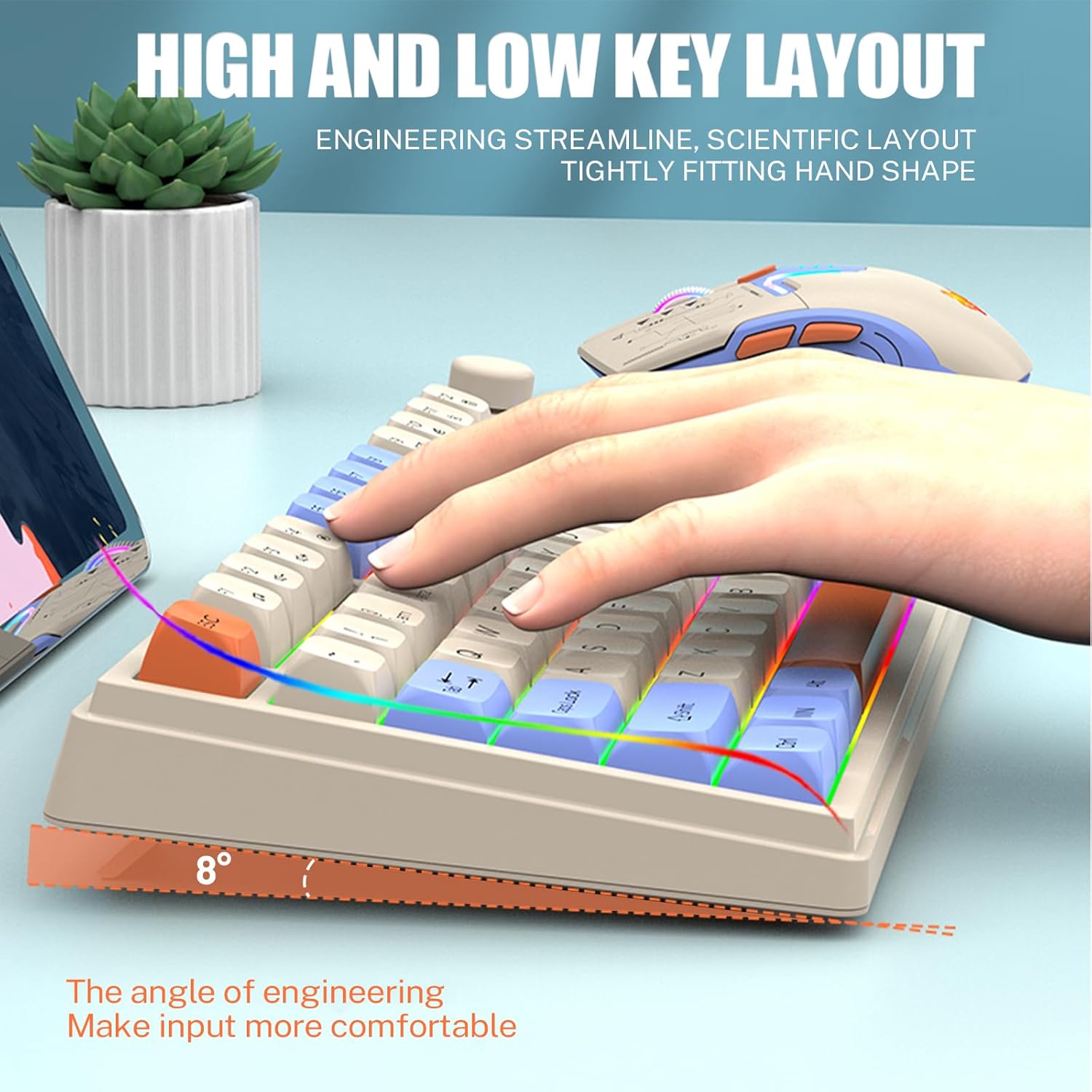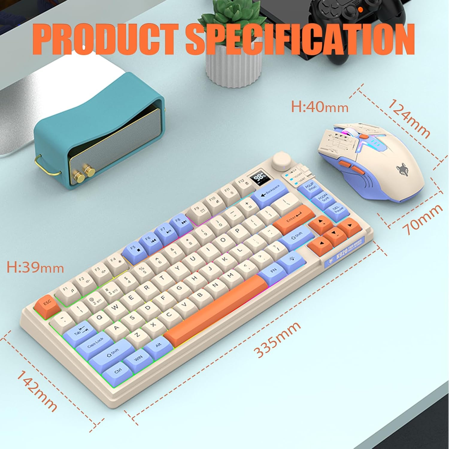 【75% Compact Design】: Wireless gaming keyboard compact mini design, save space on the desktop, novel blue & orange&white MDA Keycap color matching, separate arrow keys, No numpad, both gaming and office, easy to carry size can be easily put into the backpack.