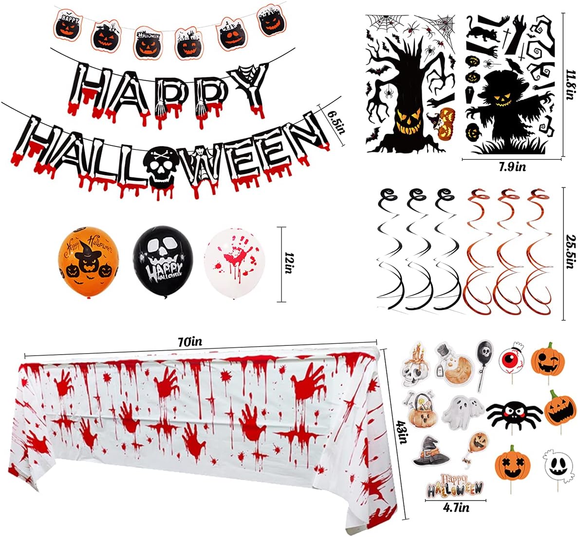 SUPER VALUE COMBINATION – We help you save money, time and energy by combining packages with high-quality, affordable products. 24 pcs 12″ halloween balloons, 2 pcs Spider balloons, 14 pcs cupcake topper, 2 pcs halloween window clings, 6 pcs Hanging Swirl, 32 pcs 3D Spider Bat Wall Decal, happy halloween banner with bloody tablecover.