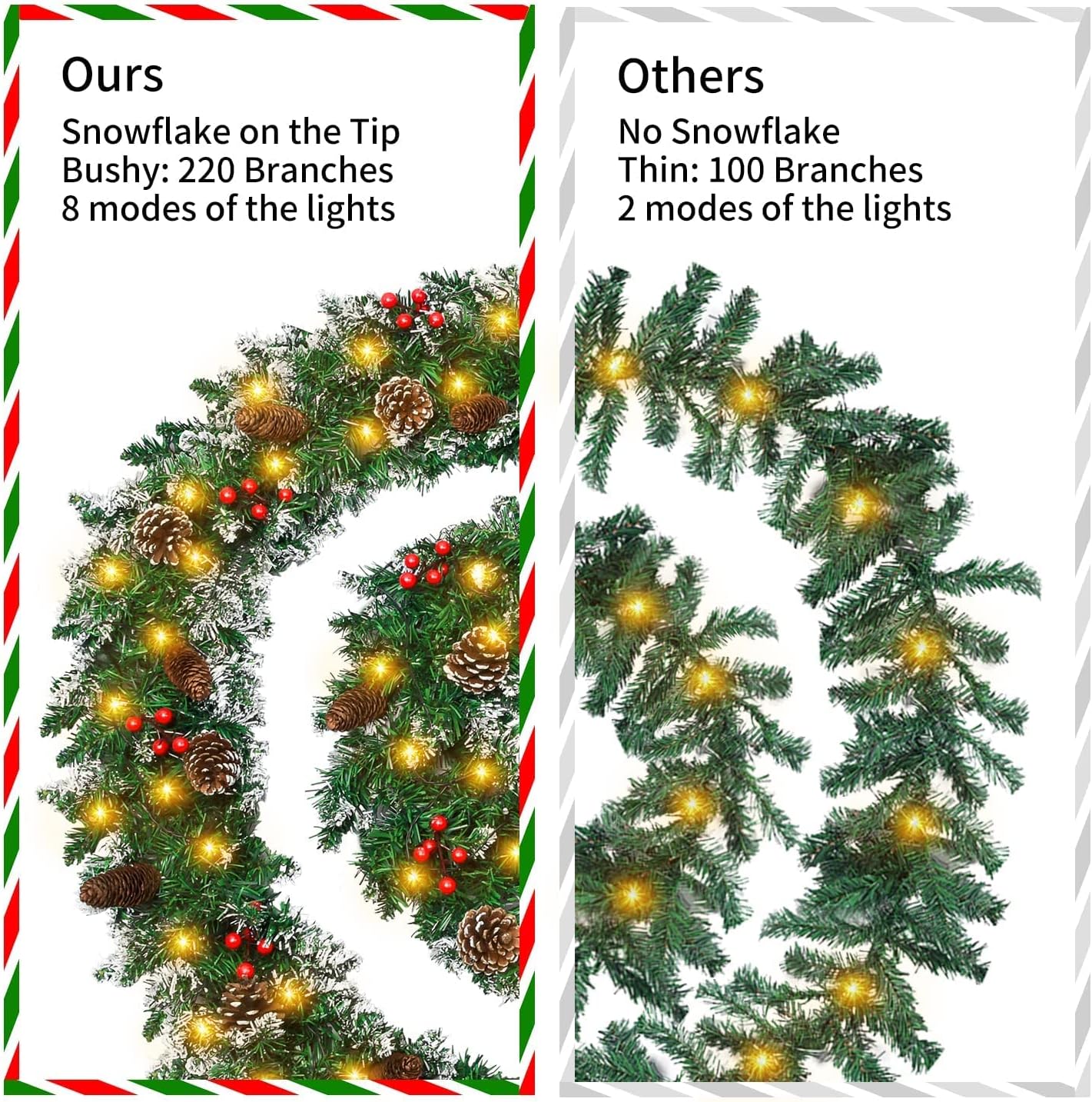 🎄[9 FEET CHRISTMAS GARLAND]-This Christmas garland measures 9 ft. Length with 220 branch tips, 11 red berry branches, and11 pine cones, provides you with a lot of freedom to use it wherever you please. Unlike other garlands,our product won’t fall apart, allowing you to utilize all 9 feet, both indoors and outdoors!