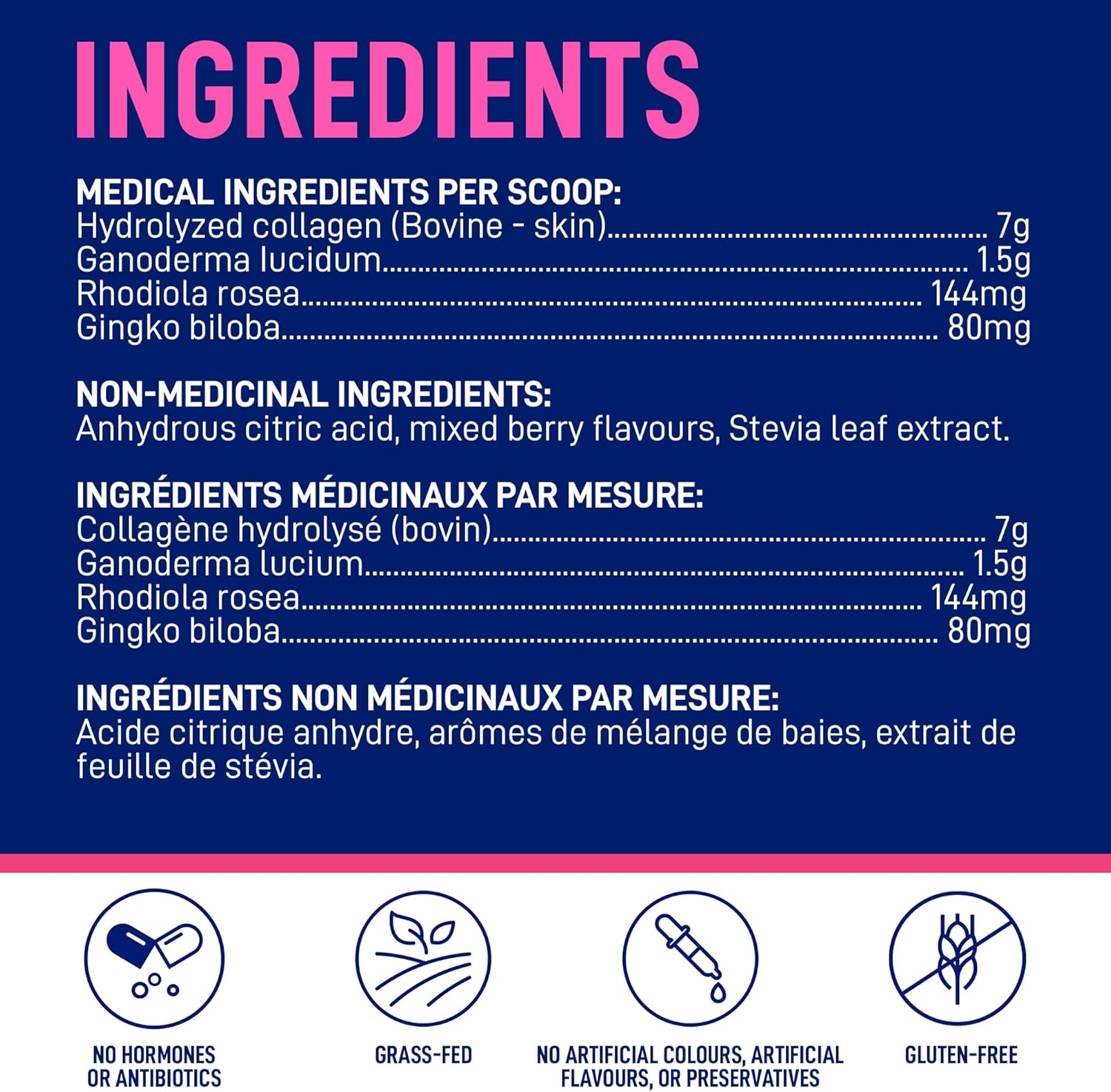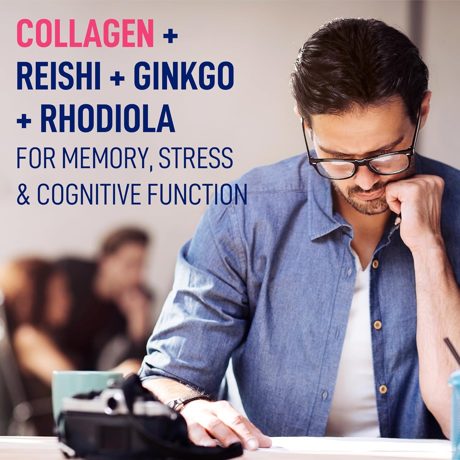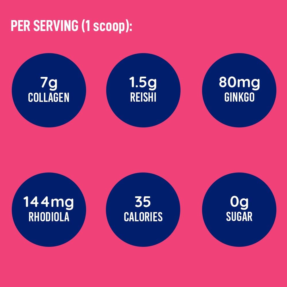 COLLAGEN & BRAIN RASPBERRY POWDER: Each serving contains 7g of type 1 and 3 hydrolyzed collagen sourced from grass-fed bovine, along with 1.5g reishi, 80mg ginkgo, and 144mg rhodiola. Zero sugar and only 35 calories per serving.