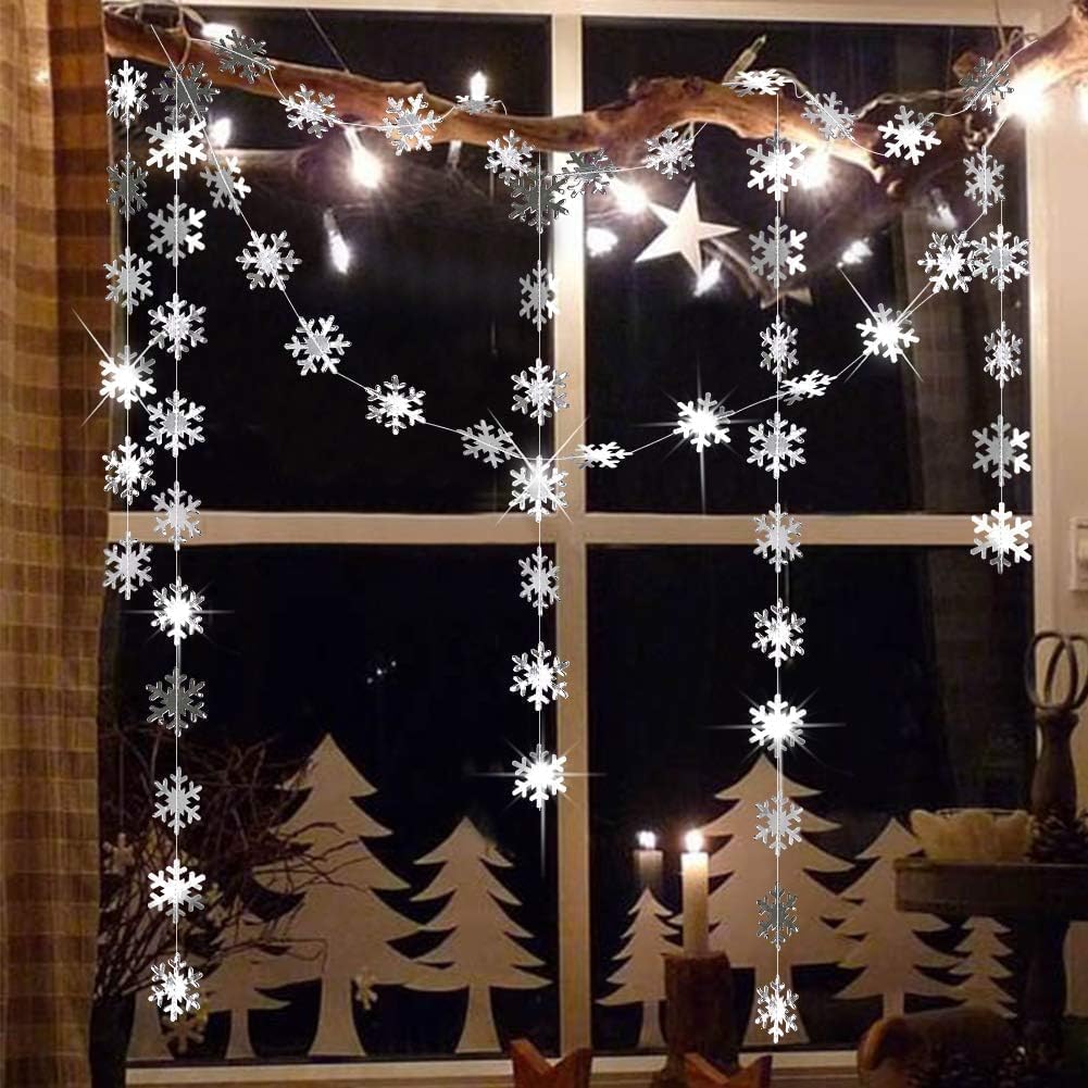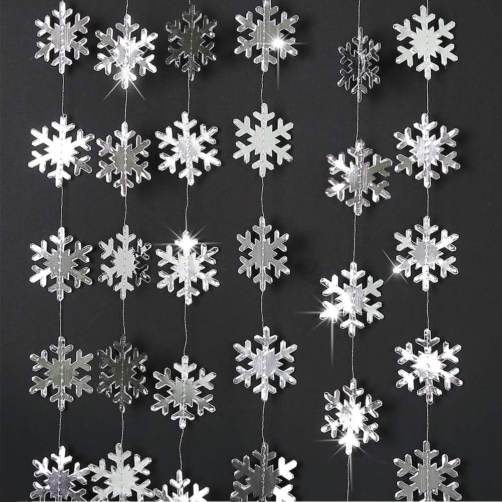 Winter Wonderland Snowflake Garland Kit: Includes 4 strings of pearl silver snowflakes, each 13 feet long (total 52 feet). Delicate 5 cm snowflakes are securely attached to a sturdy thread for easy hanging and handling.