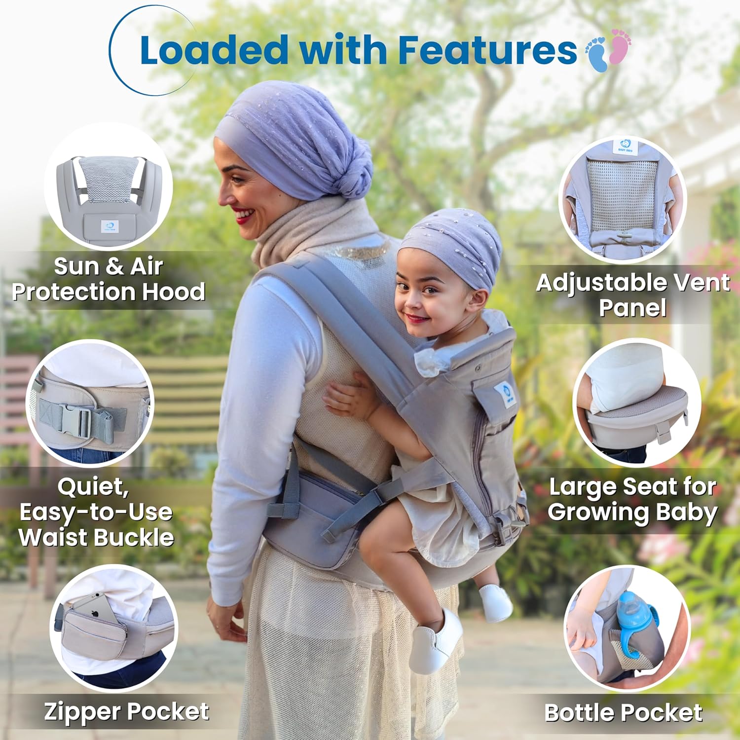 𝐁𝐮𝐢𝐥𝐭 𝐭𝐨 𝐋𝐚𝐬𝐭, 𝐌𝐚𝐝𝐞 𝐟𝐨𝐫 𝐋𝐢𝐟𝐞’𝐬 𝐋𝐢𝐭𝐭𝐥𝐞 𝐀𝐝𝐯𝐞𝐧𝐭𝐮𝐫𝐞𝐬: Crafted from high-quality cotton and breathable mesh, this baby carrier offers the perfect balance of durability and softness. It features a protective hood to shield your baby from sun and wind, plus a ventilated panel that promotes airflow and comfort. Gentle on delicate skin and easy to clean— machine or hand washable for quick, convenient care and long-lasting use.