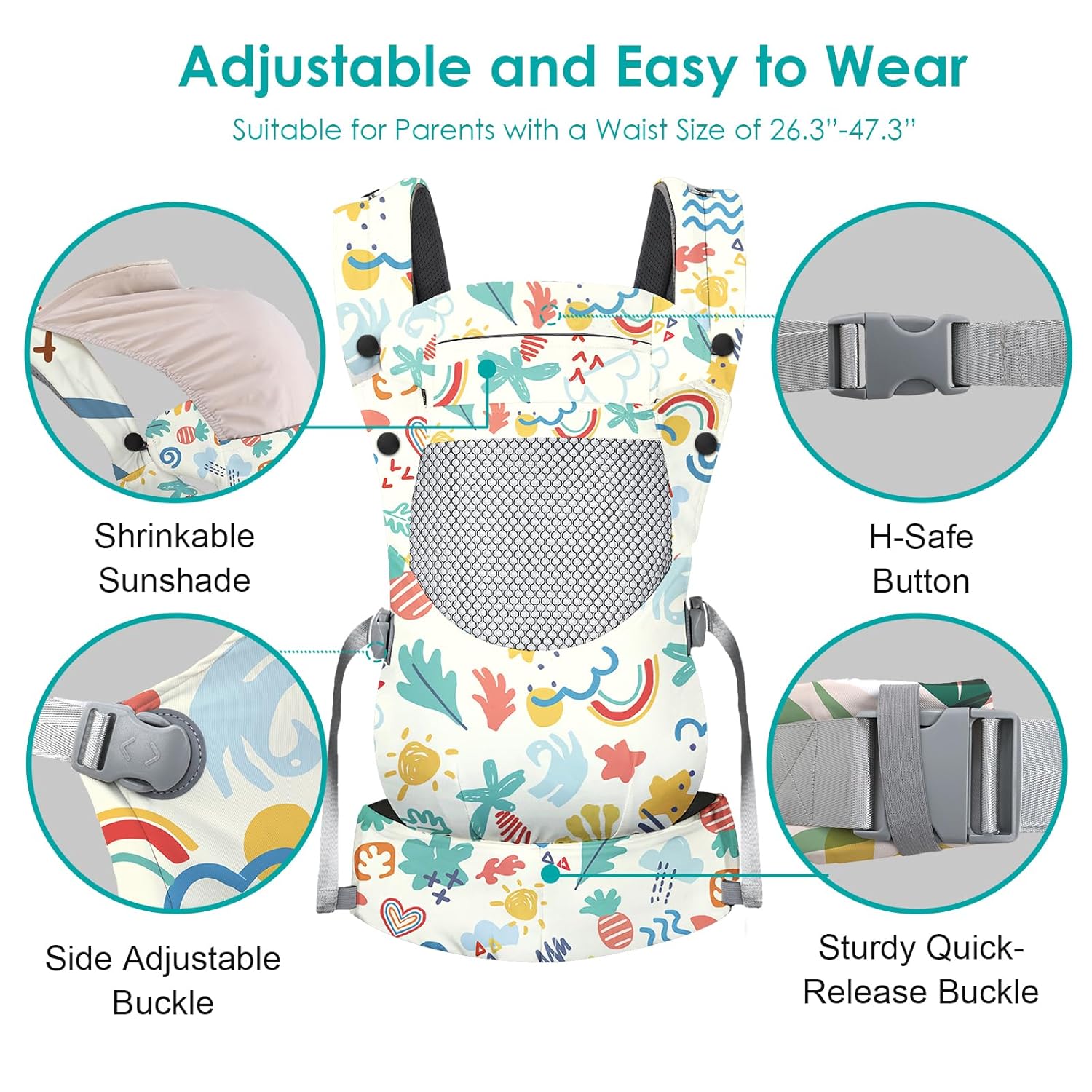Ergonomics: The baby carrier features an adjustable ergonomic seat, wider and thicker shoulder straps and waistbelt, which evenly distributes the weight to the wearers waist, tummy and shoulders for a more comfortable fit