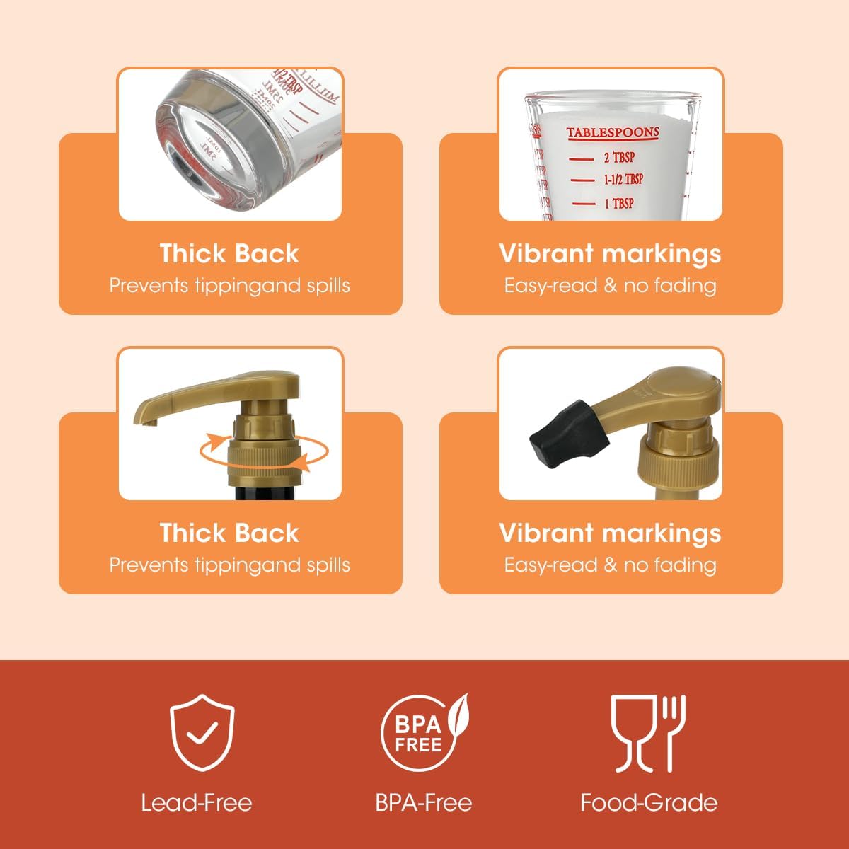 4-in-1 Measurement Design: Made from heavyweight, food-safe glass, this measuring cup features large, vibrant, easy-to-read markings in ml, oz, tsp, and tbsp. The cup is built to last and is dishwasher-safe for easy cleaning.