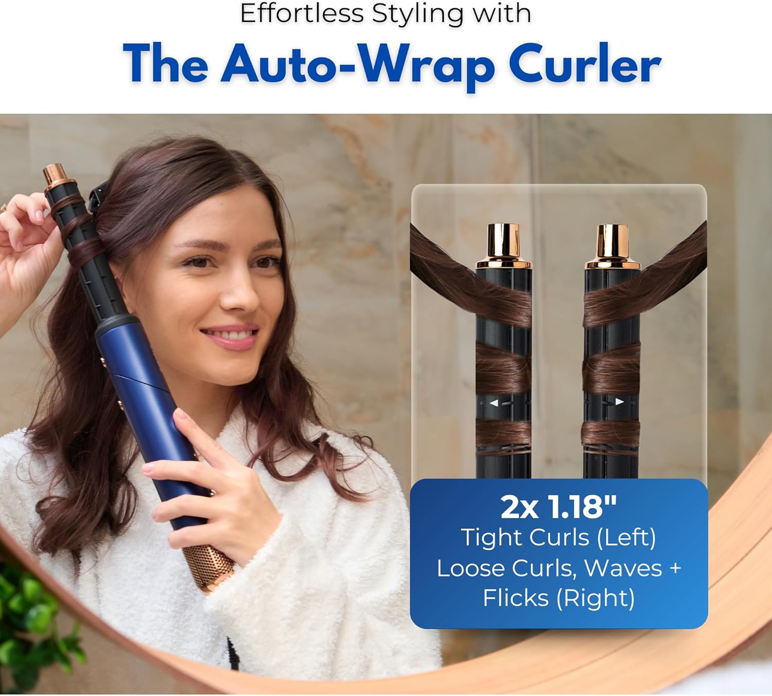 1.18” AUTO-WRAP CURLERS – Equipped with a high-speed brushless motor and an advanced air duct design, this air curling iron uses the best effect to create a swirling airflow around the curler, automatically pulling in and wrapping the hair for smooth, voluminous curls. It includes two auto-wrap curlers, allowing for curls in different directions.