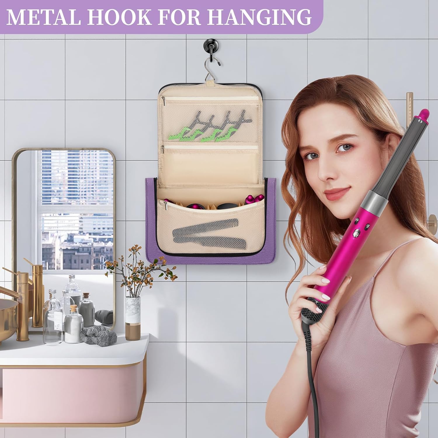 Can be hung on the wall on the hook or door handle for easy useThe top handle design makes it easy to carry and take your curling iron anywhere