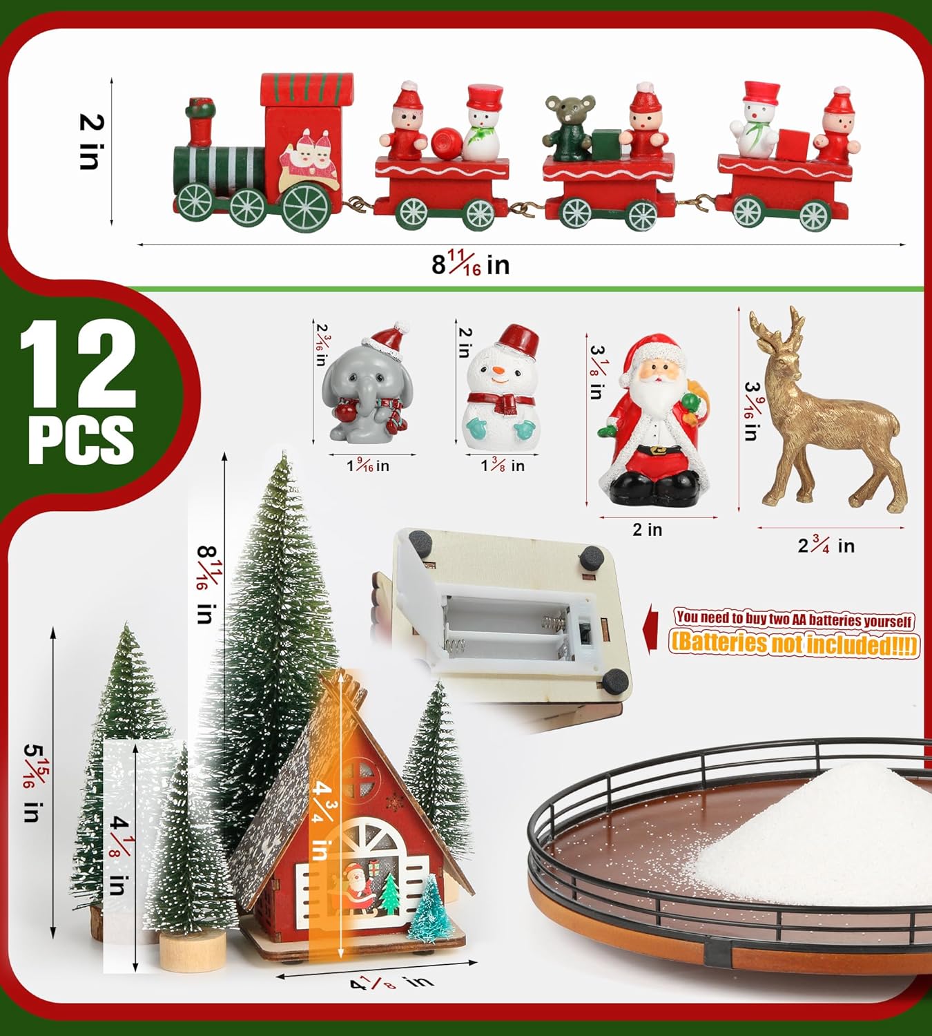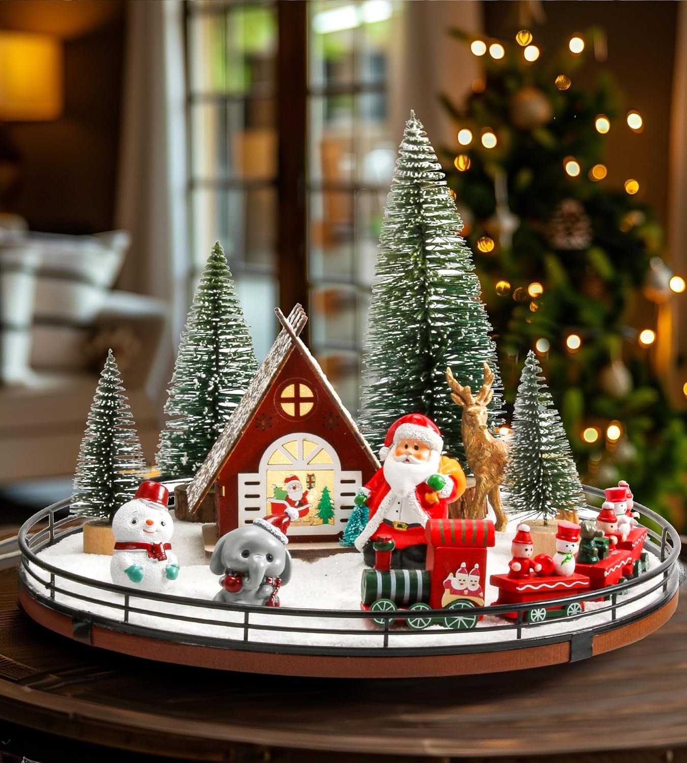 AMH 12 PCS Christmas Table Decorations Set with Oak Rotating Base – Xmas Town Village Centerpiece with Santa, Train, House, Trees & Figurines, Tabletop Decorations for Holiday Dining & Coffee Tables