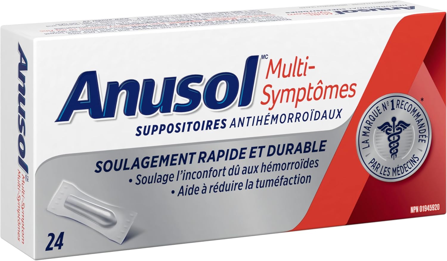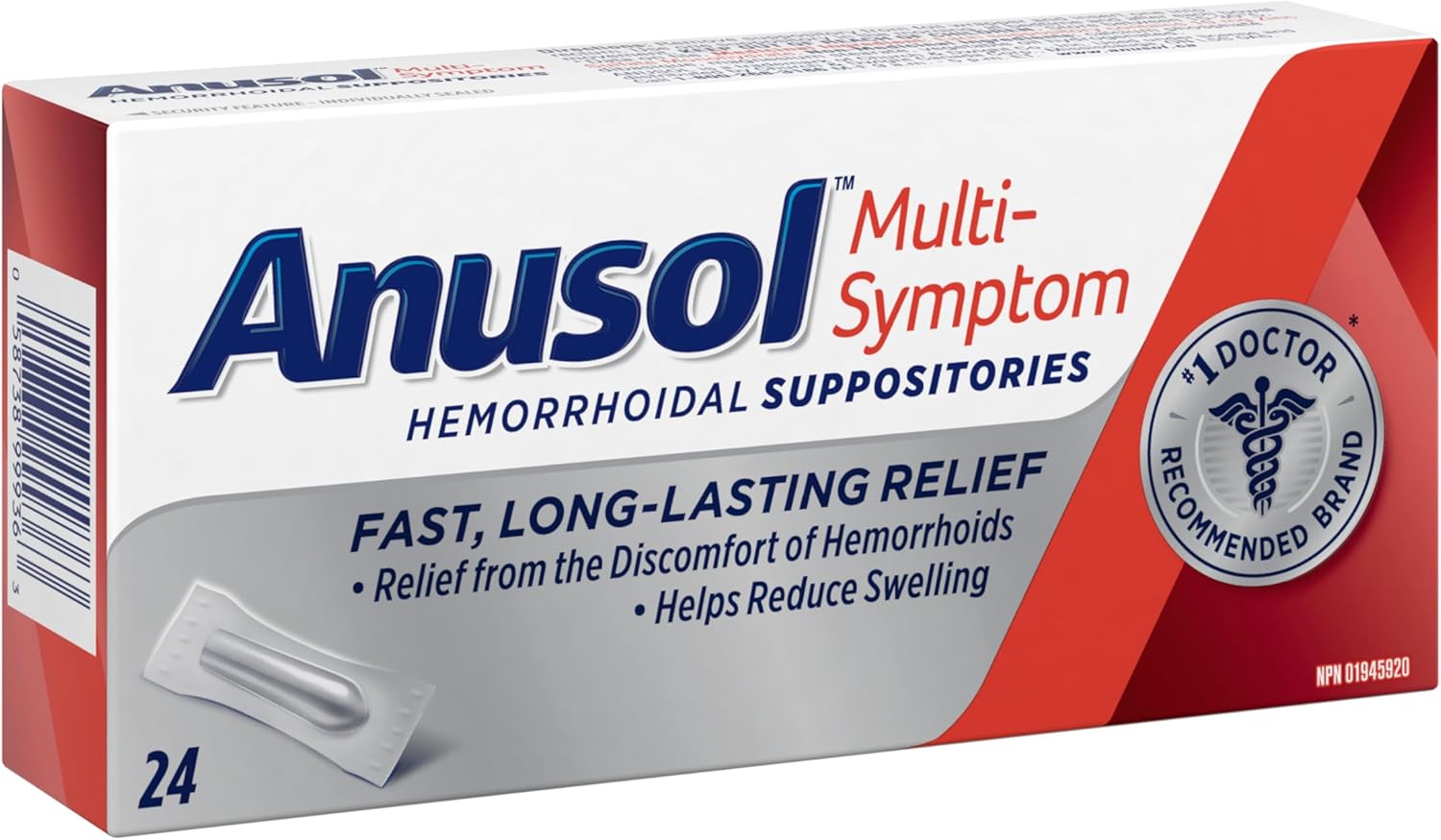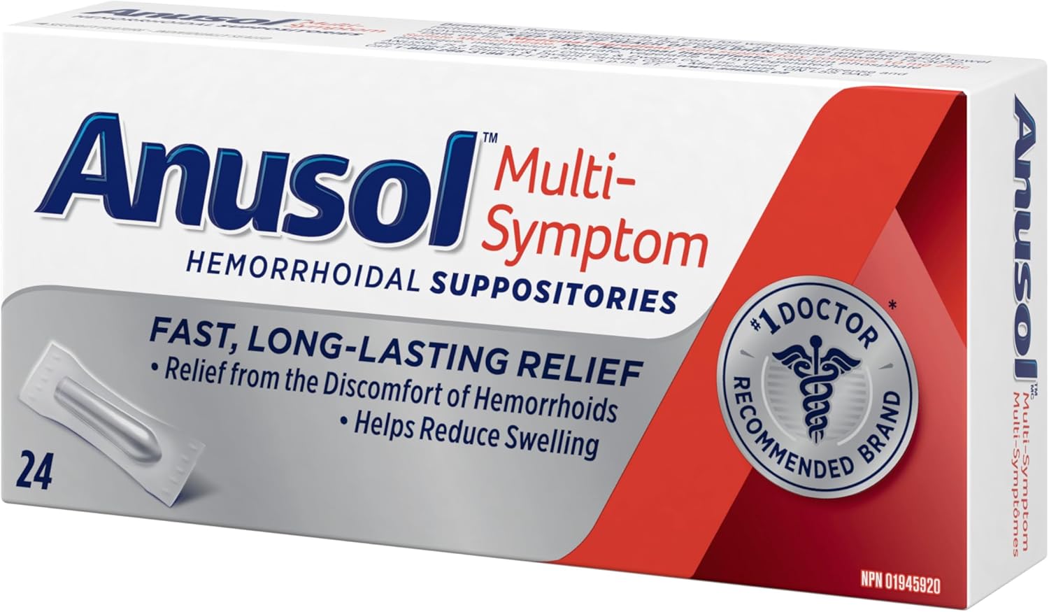Anusol Multi-symptom Hemorrhoidal Suppositories provide fast and long-lasting relief for the discomfort and swelling caused by hemorrhoids. These suppositories contain a gentle astringent that reduces swelling and promotes healing, helping you get comfortable again. Designed for mess-free application, they offer fast and effective relief for internal hemorrhoids. For comprehensive hemorrhoid care, begin by cleansing and cooling with Anusol Cleansing Wipes. Then, reduce and relieve symptoms by using Anusol Multi-symptom suppositories every 4 hours, or as needed and after each bowel movement. Voted as the number one hemorrhoid treatment by physicians in The Medical Post and Profession Santé 2024 Survey on OTC Counselling and Recommendations, Anusol is the doctor recommended brand for effective relief.* *Data on file 2024