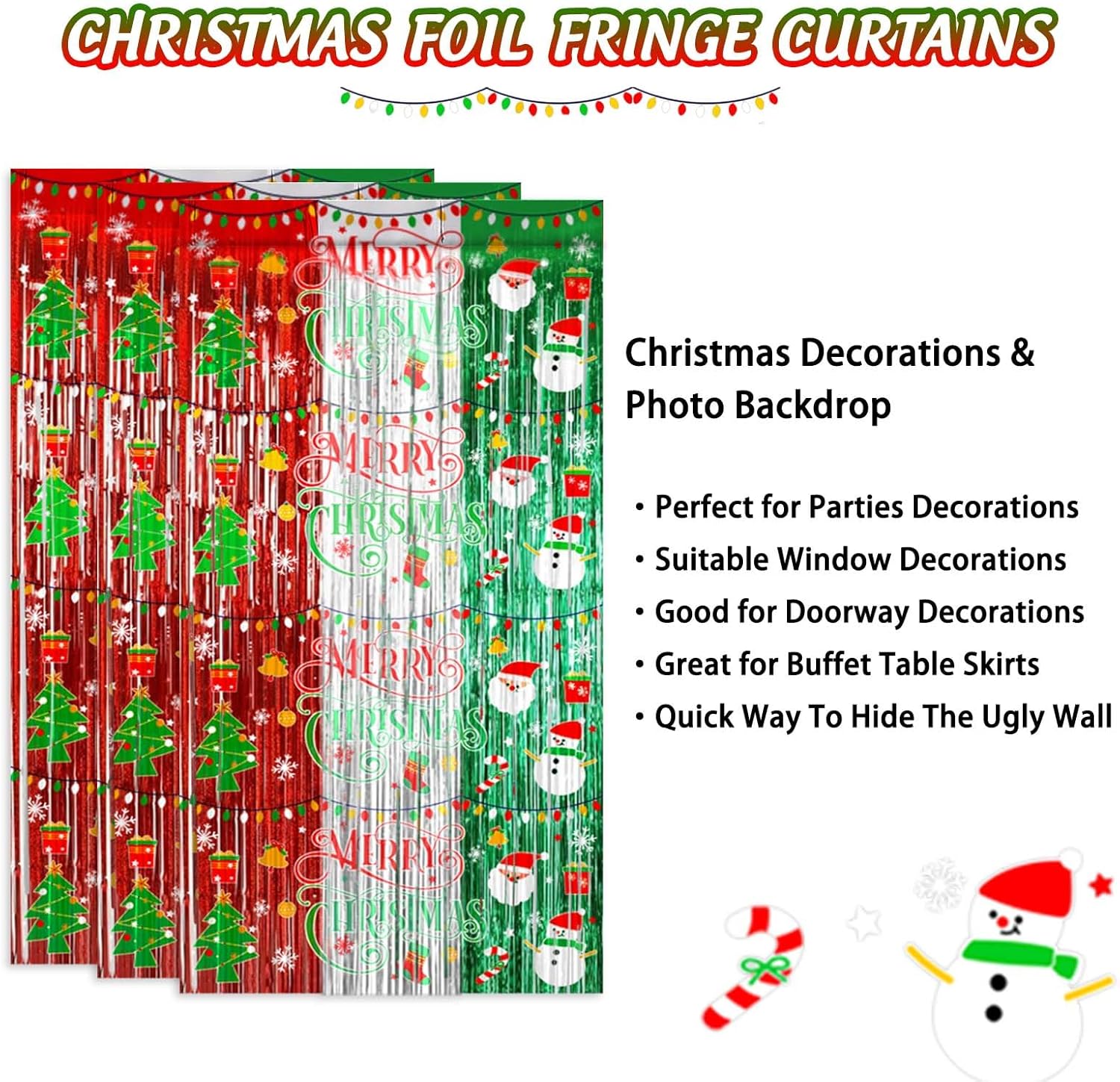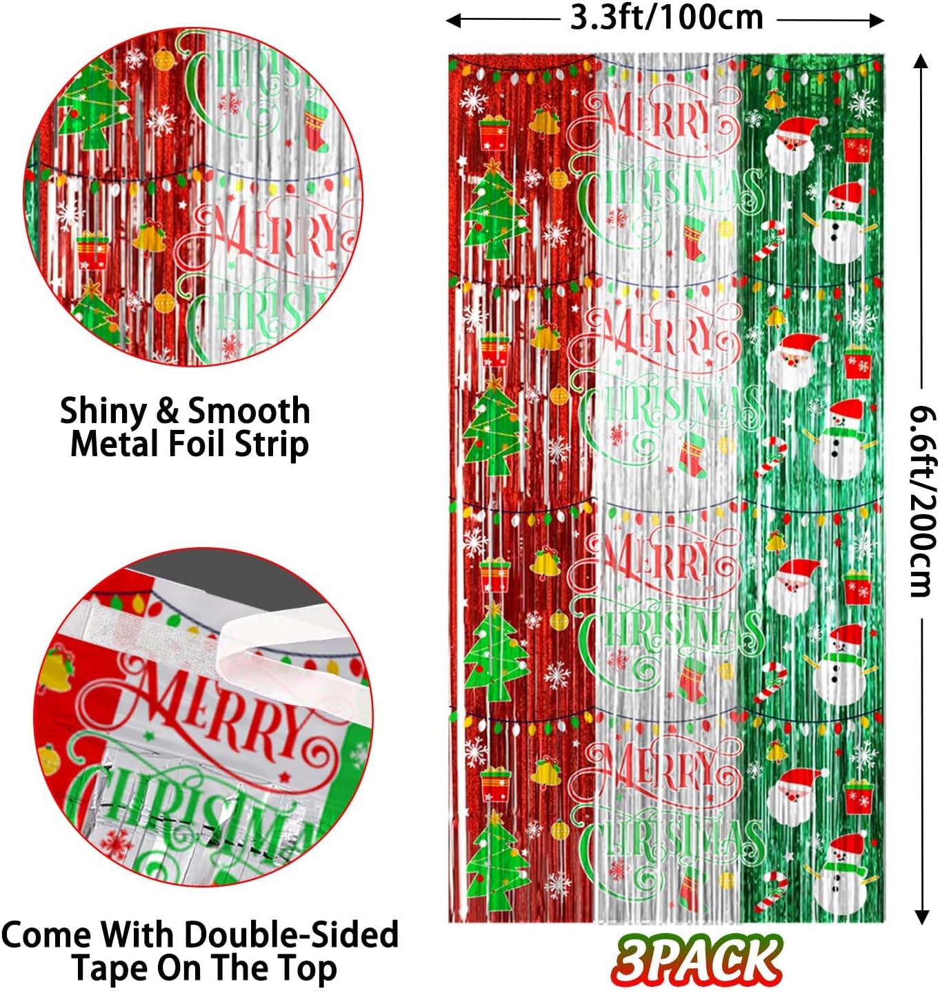 3 packs of Christmas-themed red silver and green foil fringe curtains, size (width x drop) 3.3 x 6.6 ft each, perfect for Christmas party, New Year’s Eve party, Friends mas party, Ugly sweater party, and general party decorations.