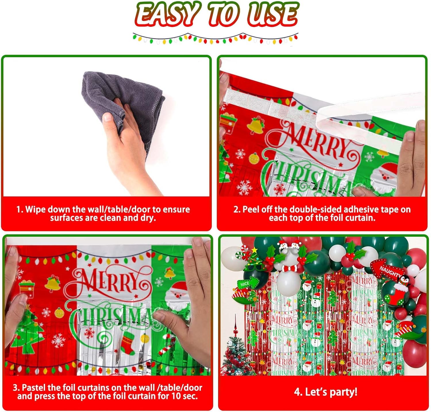 This tinsel backdrop comes with adhesive strip, just tear off the back of the double-sided tape and stick it on the top of door or anywhere you want, you can get a beautiful party background full of Christmas atmosphere in seconds.